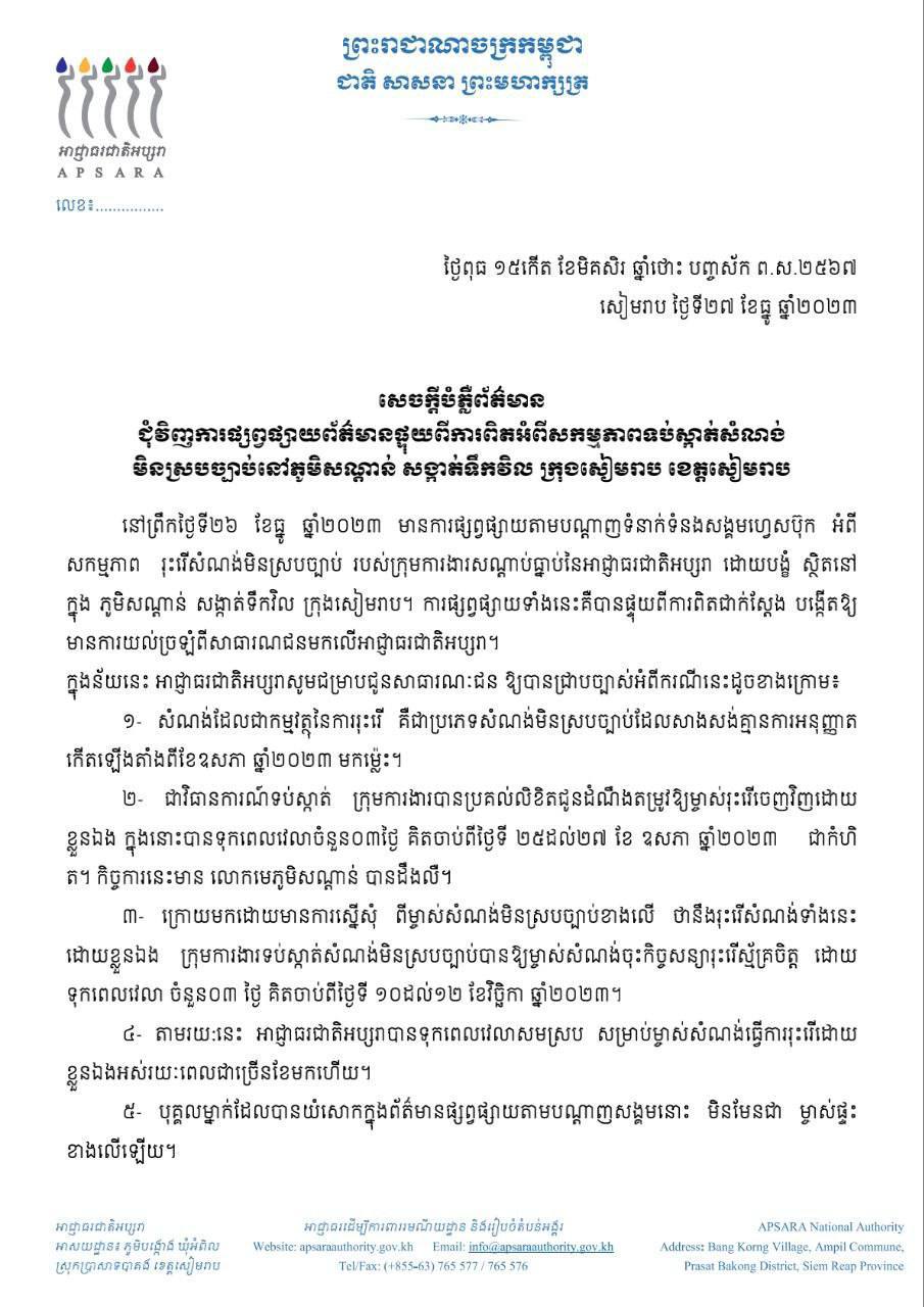 ខេត្តសៀមរាប៖ នៅថ្ងៃទី២៧ ខែធ្នូ ឆ្នាំ២០២៣ យោងតាមការចុះផ្សាយរបស់ អាជ្ញាធរជាតិអប្សរា បានចេញសេចក្តីបំភ្លឺជុំវិញការផ្សព្វផ្សាយព័ត៌មាន ផ្ទុយពីការពិត អំពីសកម្មភាពទប់ស្កាត់សំណង់មិនស្របច្បាប់ នៅភូមិសណ្តាន់ សង្កាត់ទឹកវិល ក្រុងសៀមរាប ខេត្តសៀមរាប។