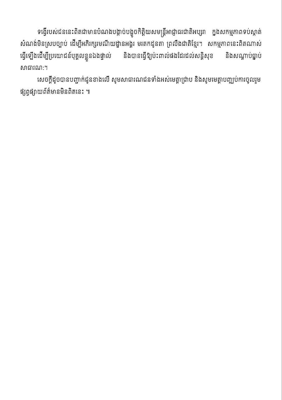 សេចក្តីដូចបានបញ្ជាក់ជូនខាងលើ សូមសាធារណជនទាំងអស់មេត្តាជ្រាប និងសូមមេត្តាបញ្ឈប់ការចូលរួម ផ្សព្វផ្សាយព័ត៌មានមិនពិតនេះ ៕ ប្រភព៖ អាជ្ញាធរជាតិអប្សរា Apsara National Authority
