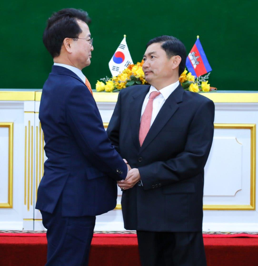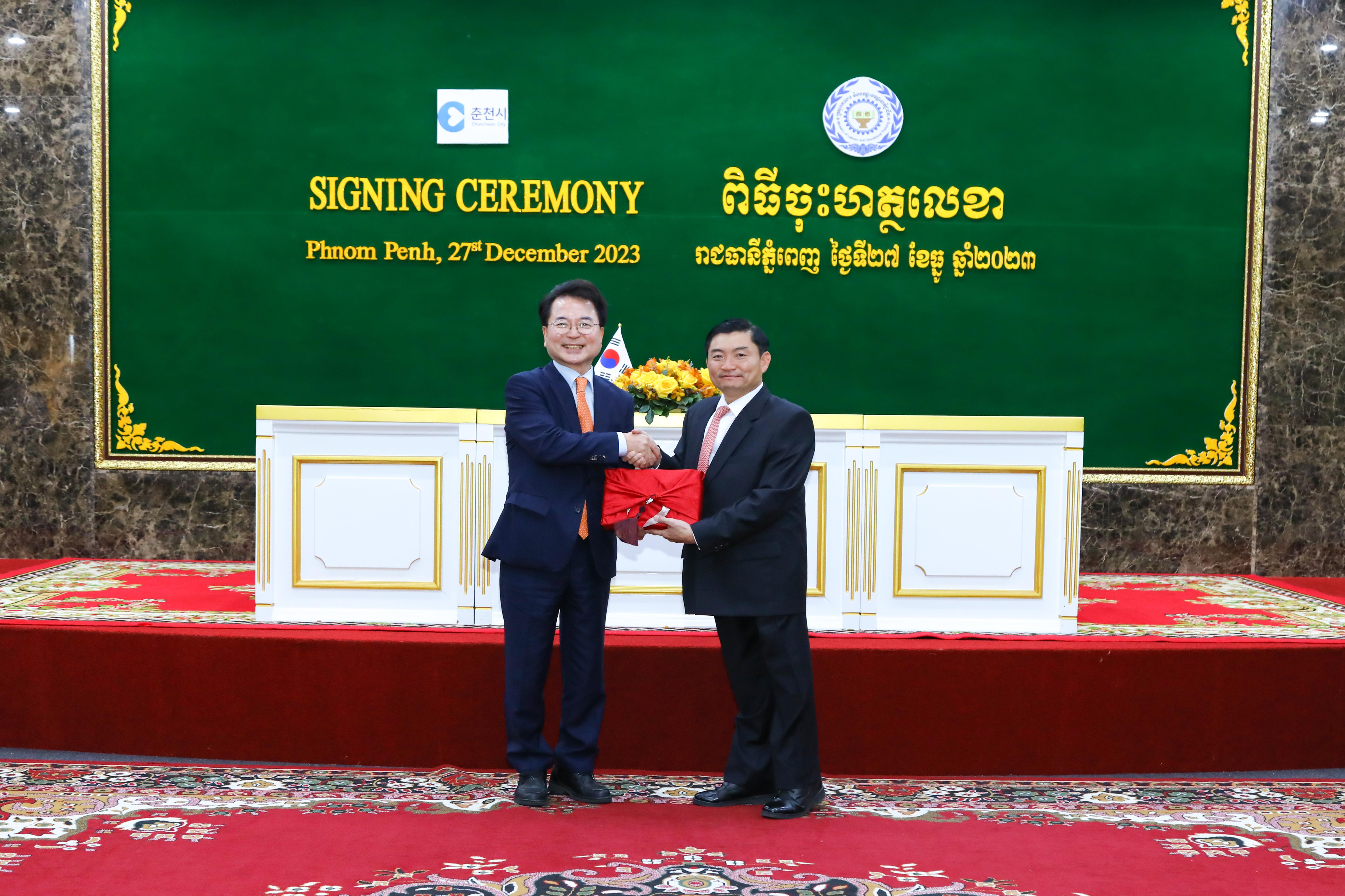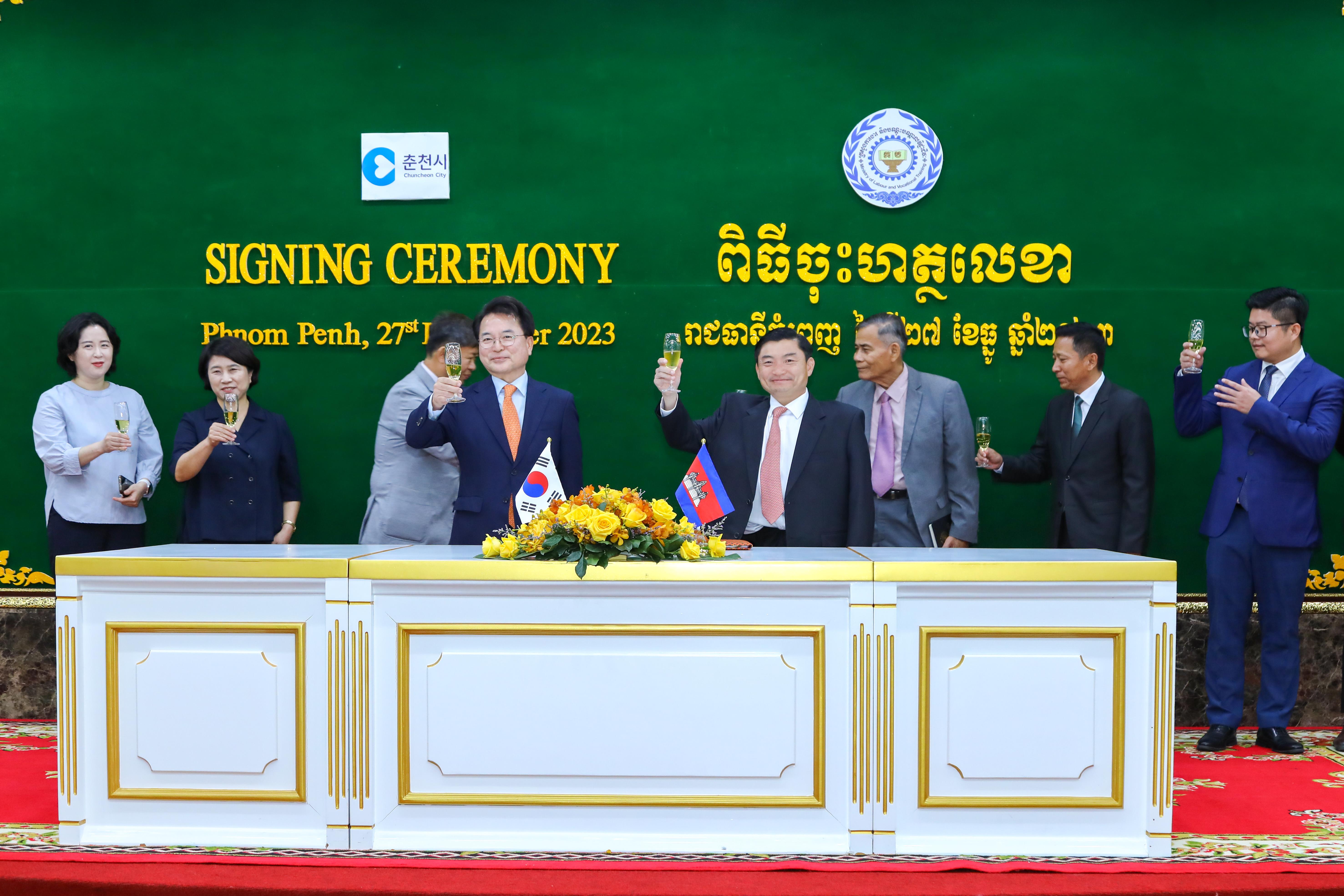 (ភ្នំពេញ)៖ រដ្ឋមន្ត្រីក្រសួងការងារ និងបណ្តុះបណ្តាលវិជ្ជាជីវៈ នៅថ្ងៃទី២៧ ខែធ្នូ ឆ្នាំ២០២៣នេះ បានចុះអនុស្សរណៈយោគយល់គ្នាជាមួយនឹងអភិបាលក្រុងឈុនឆន់ ខេត្តកាំងវ៉ុននៃធារណរដ្ឋកូរ៉េ ដើម្បីផ្តល់ឱកាសជូនពលរដ្ឋកម្ពុជាដែលមានបំណងទៅធ្វើការជាពលកររដូវកាលនៅប្រទេសកូរ៉េខាងត្បូង។ ពិធីចុះអនុស្សរណៈនេះ គឺធ្វើឡើងនៅទីស្តីការក្រសួងការងារ និងបណ្តុះបណ្តាលវិជ្ជាជីវៈ។