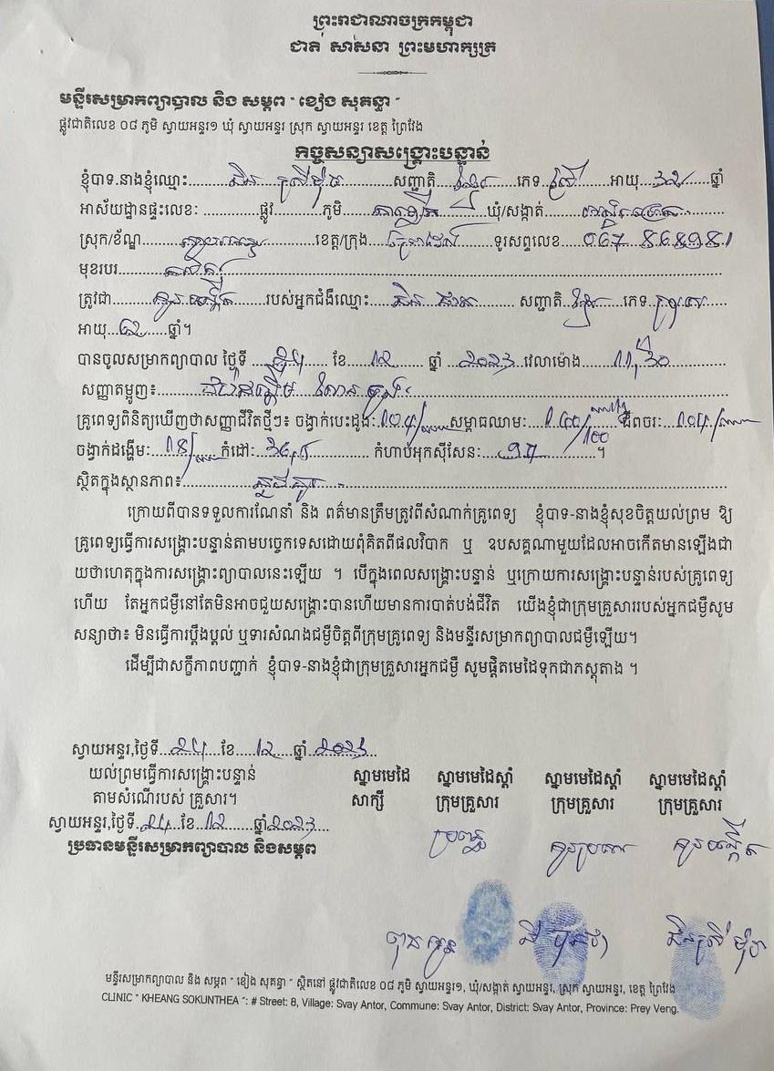គ្រូពេទ្យនៅមន្ទីរសម្រាកព្យាបាល ខៀង សុគន្ធា បានបន្តថា ដោយមានការអង្វរពីក្រុមគ្រួសារនៃអ្នកជំងឺឲ្យគ្រូពេទ្យជួយសង្គ្រោះ ទើបមន្ទីរសម្រាកព្យាបាលយល់ព្រមជួយ សង្គ្រោះ ហើយបានធ្វើកិច្ចសន្យាត្រឹមត្រូវផងដែរ៕ ផ្តល់សិទ្ធិដោយ៖ freshnews