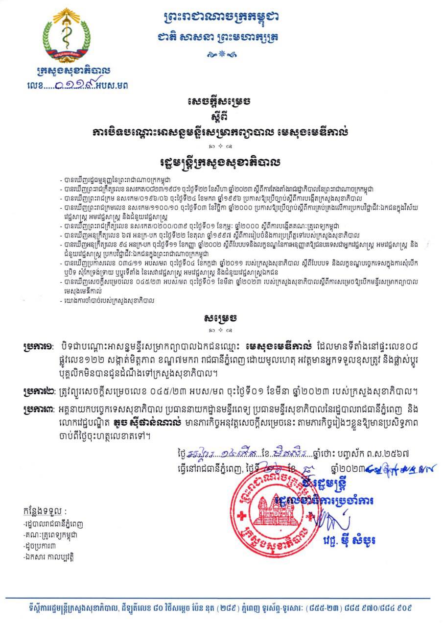 រាជធានីភ្នំពេញ៖ នៅថ្ងៃទី២៧ ខែធ្នូ ឆ្នាំ២០២៣ យោងតាមការចុះផ្សាយរបស់ ក្រសួងសុខាភិបាលនៃព្រះរាជាណាចក្រកម្ពុជា បានចេញសេចក្តីសម្រេច ស្តីពីការបិទបណ្តោះអាសន្នមន្ទីរសម្រាកព្យាបាល មេសុងមេឌីកាល់។