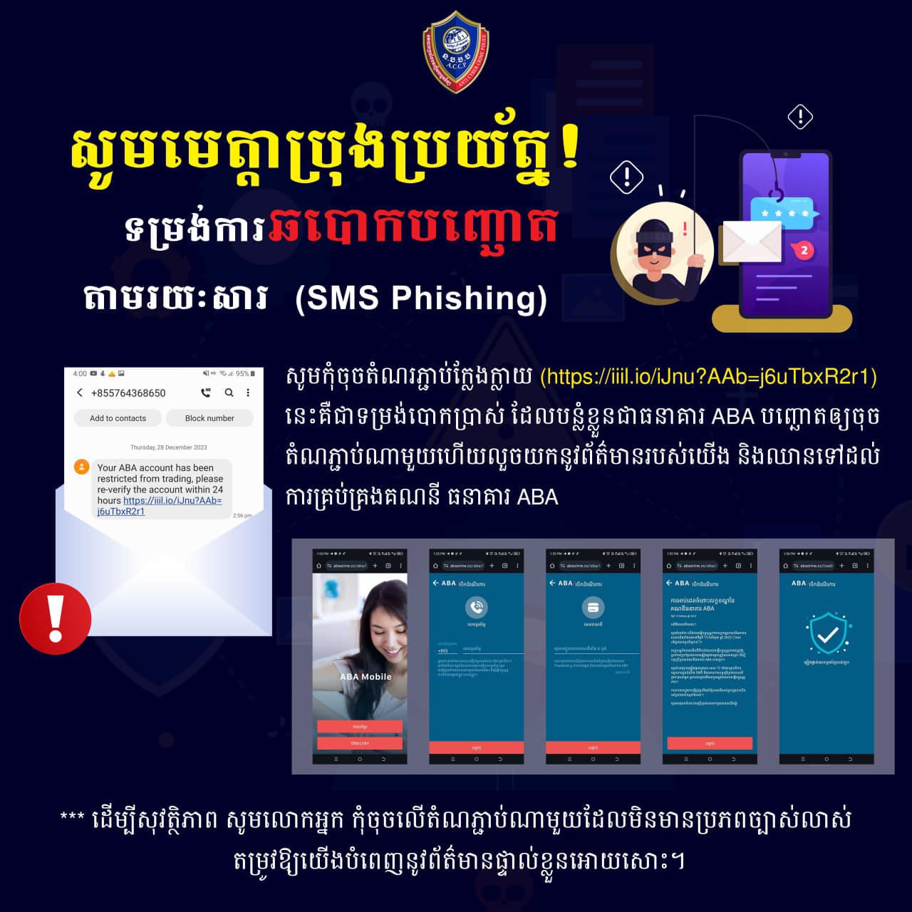 រាជធានីភ្នំពេញ៖ នៅថ្ងៃទី២៩ ខែធ្នូ ឆ្នាំ២០២៣ យោងតាមការចុះផ្សាយរបស់ ផ្សព្វផ្សាយអប់រំ ក្រសួងមហាផ្ទៃ បានឱ្យដឹងថា ក្នុងរយៈពេលប៉ុន្មានថ្ងៃកន្លងមកនេះ មានសកម្មភាពឆបោកថ្មីមួយបានកើតឡើងដែលមានគោលដៅវាយប្រហារដើម្បីលួច និងឈានទៅគ្រប់គ្រងគណនីធនាគារ ABA តាមរយៈការផ្ញើសារជាតំណភ្ជាប់ (Link) ទៅកាន់លេខទូរស័ព្ទរបស់អ្នកប្រើប្រាស់។