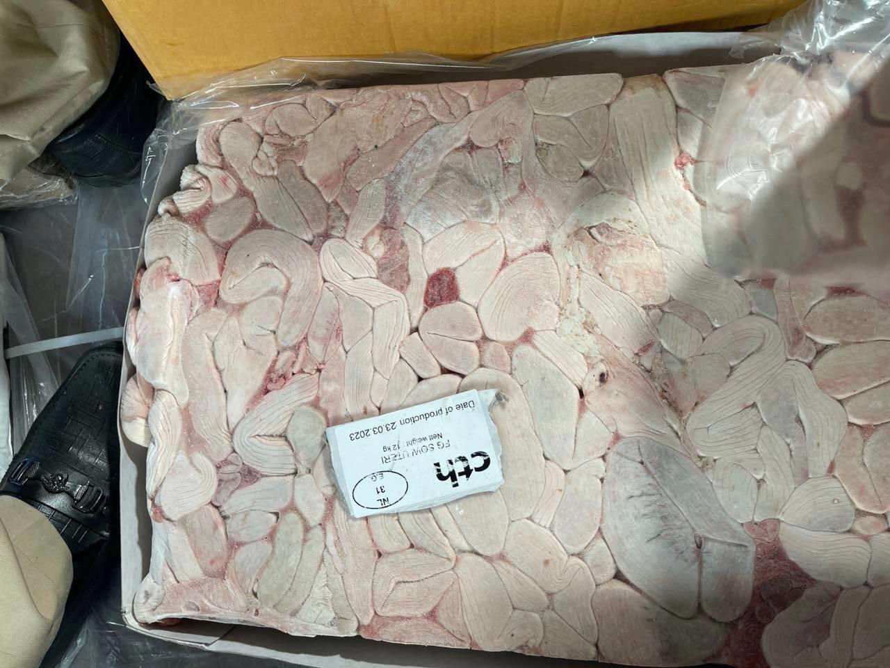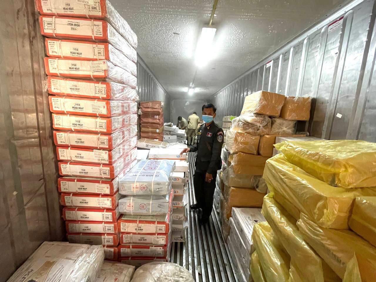 ក្រោយពីការឆែកឆេរ និងត្រួតពិនិត្យជាក់ស្តែង សមត្ថកិច្ចបានរកឃើញវត្ថុតាងសាច់ជ្រូក សាច់គោ សាច់ទា សាច់មាន់ និងគ្រឿងក្នុងបង្កក សរុបទម្ងន់១៨,៨៤៨គីឡូក្រាម។