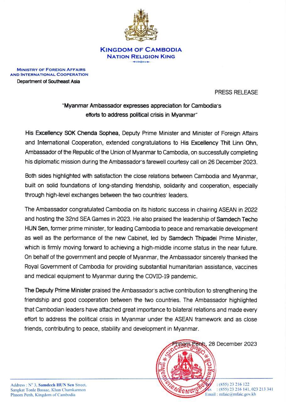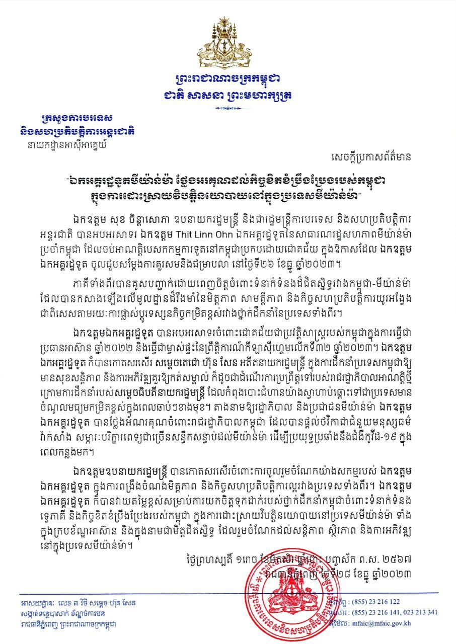 ឯកអគ្គរដ្ឋទូតមីយ៉ាន់ម៉ា ថ្លែងអរគុណដល់កិច្ចខិតខំប្រឹងប្រែងរបស់កម្ពុជា ក្នុងការដោះស្រាយវិបត្តិនយោបាយនៅក្នុងប្រទេសមីយ៉ាន់ម៉ា