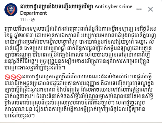 រាជធានីភ្នំពេញ៖ យោងតាមការចុះផ្សាយរបស់ នាយកដ្ឋានប្រឆាំងបទល្មើសបច្ចេកវិទ្យា បានឱ្យដឹងថា ក្រោយពីបានទទួលបណ្តឹងពីជនរងគ្រោះពាក់ព័ន្ធ នឹងការកម្ចីអនឡាញ នៅថ្ងៃទី២៦ ខែធ្នូ ឆ្នាំ២០២៣ ដោយមានការឯកភាពពី អយ្យការអមសាលាដំបូងរាជធានីភ្នំពេញ នាយកដ្ឋានប្រឆាំងបទល្មើសបច្ចេកវិទ្យា បានឃាត់ខ្លួនជនសង្ស័យម្នាក់ ឈ្មោះ សំ ចាន់ធឿន ភេទប្រុស អាយុ៣០ឆ្នាំ ពាក់ព័ន្ធការផ្តល់ប្រាក់កម្ចីអនឡាញដោយគ្មានច្បាប់អនុញ្ញាត បរិហារកេរ្តិ៍ និងក្លែងឯកសារ ហើយបានបញ្ជូនទៅតុលាការដើម្បីអនុវត្តនីតិវិធីបន្ត។