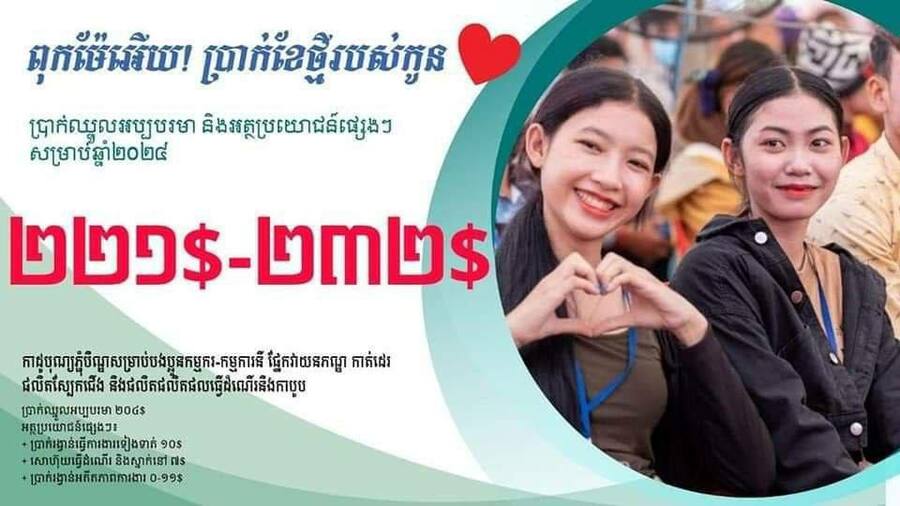 សូមបញ្ជាក់ថា សម្តេចមហាបវរធិបតី ហ៊ុន ម៉ាណែត នាយករដ្ឋមន្ត្រីនៃកម្ពុជា កាលពីរសៀលថ្ងៃទី២៨ ខែកញ្ញា ឆ្នាំ២០២៣ បានប្រកាសការដំឡើងប្រាក់ឈ្នួល ជូនដល់កម្មករ និយោជិត ផ្នែកវាយនភណ្ឌ កាត់ដេរ ផលិតស្បែកជើង និងផលិតផលិតផលធ្វើដំណើរ និងកាបូបចំនួន៤ដុល្លារថែមទៀត សម្រាប់ឆ្នាំ២០២៤ខាងមុខនេះ ដែលនឹងធ្វើឱ្យប្រាក់ឈ្នួលអប្បបរមា (ទាបបំផុត) របស់កម្មករកើនដល់សរុប ២០៤ដុល្លារក្នុង១ខែដែលក្នុងចំនួននេះ សម្តេចនាយករដ្ឋមន្ត្រីប្រកាសបន្ថែម ២ដុល្លារ។