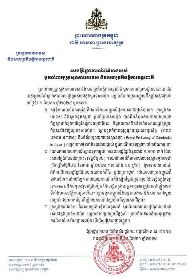 អ្នកនាំពាក្យក្រសួងការបរទេស និងសហប្រតិបត្តិការអន្តរជាតិ បានបញ្ជាក់៣ចំណុច អំពីស្ថានភាពពលរដ្ឋខ្មែររស់នៅក្នុងប្រទេសជប៉ុន បន្ទាប់ពីមានគ្រោះរញ្ជួយដីកម្រិត៧,៦វ៉ិចទ័រ នាថ្ងៃទី០១ ខែមករា ឆ្នាំ២០២៤ ដូចតទៅ៖