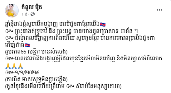 សូមបញ្ជាក់ថា យោងតាមប្រភពវីដេអូ បុគ្គលអ្នកលក់អនឡាញរូបនេះ បានបង្ហោះវីដេអូក្បាច់រាំដែលគេមិនធ្លាប់បានស្គាល់ ហើយតែងខ្លួនជាអ្នកស្នងរូបព្រះនាងឥន្ទ្រទេវី យាងមកជួយជាតិ និងសូមឱ្យកូនខ្មែរមានការគោរពព្រលឹងដូនតា ដើម្បីជាតិ ថែមទាំងបង្ហោះរូបភាពជាច្រើនសន្លឹក ពីសកម្មភាព ដែលខ្លួនបានទៅថ្វាយបង្គំទីតាំងសក្ការៈលោកតា រាជ នៅប្រាសាទអង្គវត្ត និងនៅមុខរូបចម្លាក់នានា នៅប្រាសាទព្រះខ័ន ខេត្តសៀមរាប ក្នុងអាការៈយំសោកស្រណោះ រហូតដល់អ្នកដែលបានឃើញរូបភាពទាំងនេះហើយ មានការហួសចិត្តជាខ្លាំង នូវទង្វើបុគ្គលនេះបានធ្វើឡើង។