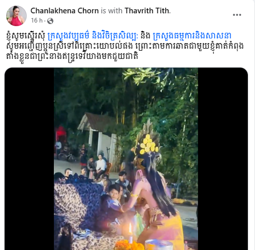 យោងតាមគណនីហ្វេសប៊ុកផ្ទាល់របស់ ជំទាវ ចន ច័ន្ទលក្ខិណា នៅថ្ងៃទី០២ ខែមករា ឆ្នាំ២០២៤ បានសរសេររៀបរាប់យ៉ាងដូច្នេះថា៖ «ខ្ញុំសូមស្នើសុំ ក្រសួងវប្បធម៌ និងវិចិត្រសិល្បៈ និង ក្រសួងធម្មការនិងសាសនា សូមអញ្ជើញប្អូនស្រីទៅពិគ្រោះយោបល់ផង ព្រោះតាមការឆាតជាមួយខ្ញុំគាត់កំពុងតាំងខ្លួនជាព្រះនាងឥន្ទ្រទេវីយាងមកជួយជាតិ »។