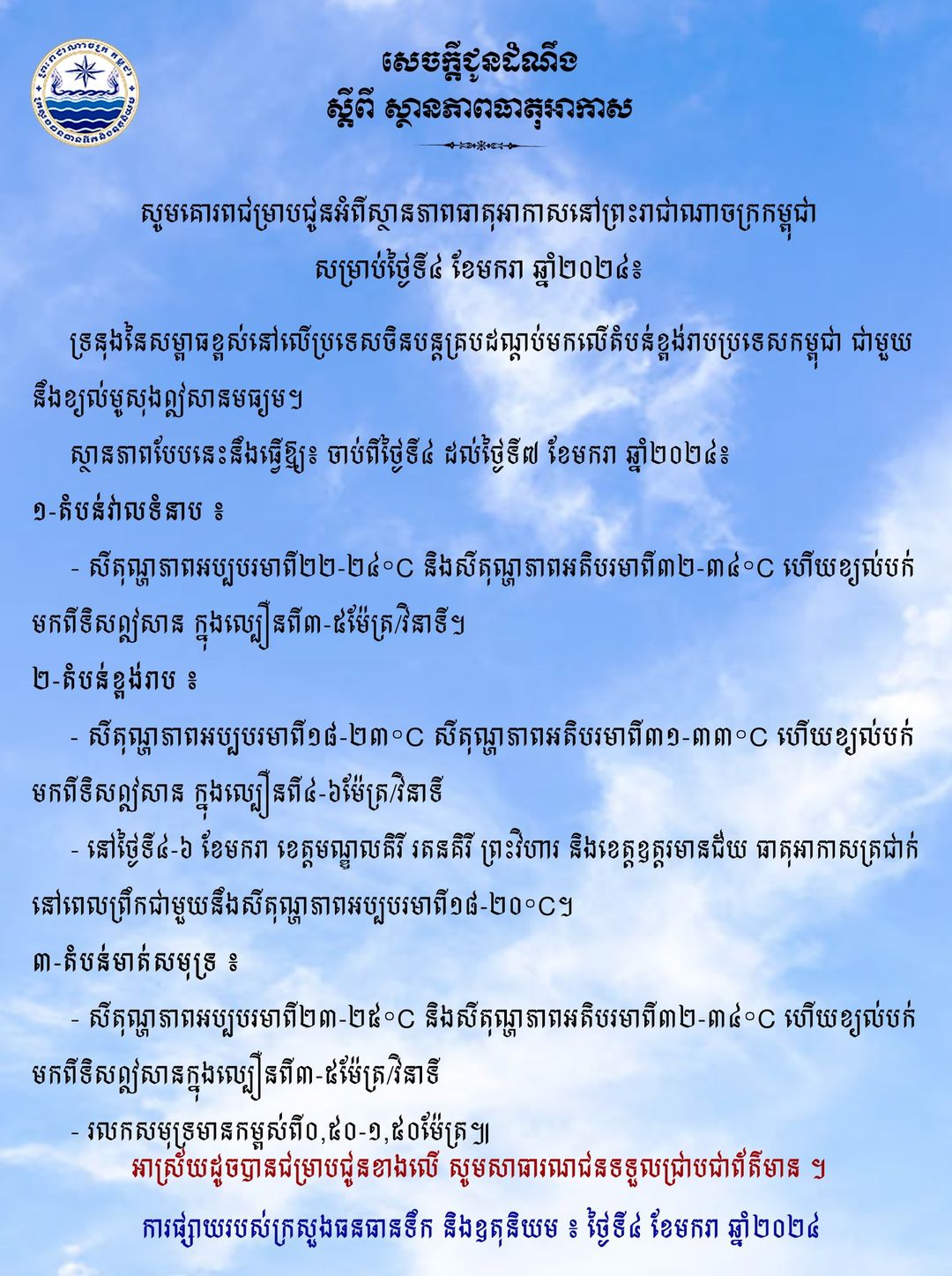 ក្រសួងបញ្ជាក់ថា ទ្រនុងនៃសម្ពាធខ្ពស់នៅលើប្រទេសចិន បន្តគ្របដណ្តប់មកលើតំបន់ខ្ពង់រាបប្រទេសកម្ពុជា ជាមួយនឹងខ្យល់មូសុងឦសានមធ្យម។ ស្ថានភាពបែបនេះនឹងធ្វើឱ្យ៖ ចាប់ពីថ្ងៃទី៤ ដល់ថ្ងៃទី៧ ខែមករា ឆ្នាំ២០២៤៖
