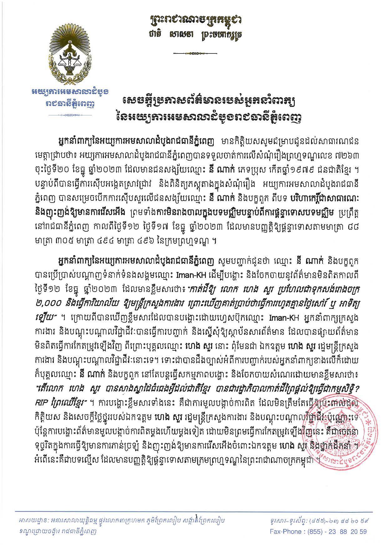 ខាងក្រោមនេះជាសេចក្តីប្រកាសរបស់ អ្នកនាំពាក្យនៃអយ្យការអមសាលាដំបូងរាជធានីភ្នំពេញ៖