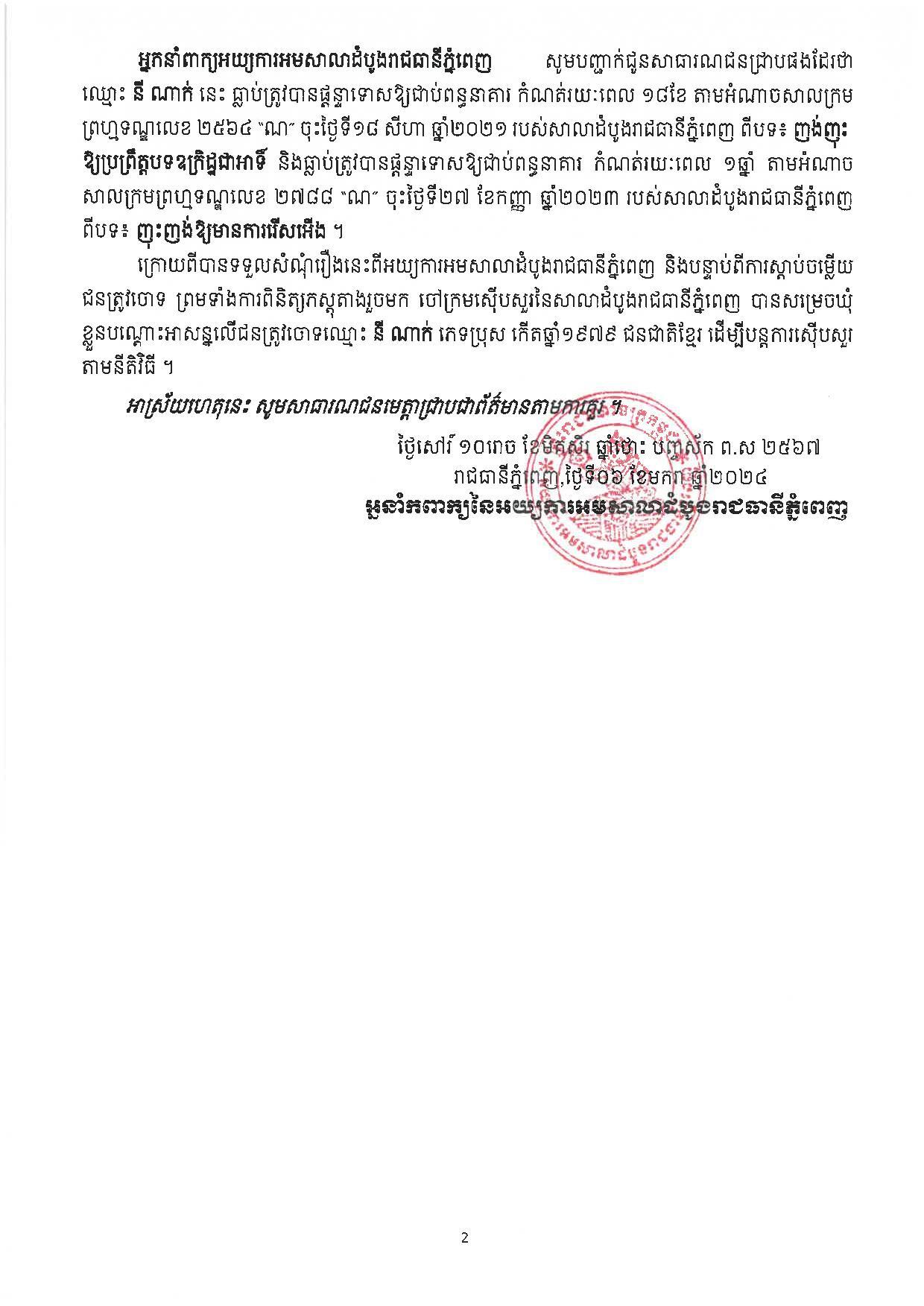 (ភ្នំពេញ)៖ អ្នកនាំពាក្យនៃអយ្យការអមសាលាដំបូងរាជធានីភ្នំពេញ នៅថ្ងៃទី០៧ ខែមករា ឆ្នាំ២០២៤នេះ បានចេញសេចក្តីប្រកាសផ្លូវការមួយ អំពីការចោទប្រកាន់ និងឃុំខ្លួន លោក នី ណាក់ ពីបទ បរិហាកេរ្តិ៍ជាសាធារណៈ និងញុះញង់ឱ្យមានការរើសអើង ព្រមទាំងការមិនរាងចាលក្នុងបទមជ្ឈិមបន្ទាប់ពីការផ្តន្ទាទោសបទមជ្ឈិម ប្រព្រឹត្តនៅរាជធានីភ្នំពេញ កាលពីថ្ងៃទី១២ ថ្ងៃទី១៧ ខែធ្នូ ឆ្នាំ២០២៣ ដែលមានបញ្ញត្តិឱ្យផ្តន្ទាទោសតាមមាត្រា ៨៨ មាត្រា ៣០៥ មាត្រា ៤៩៤ មាត្រា ៤៩៦ នៃក្រមព្រហ្មទណ្ឌ។