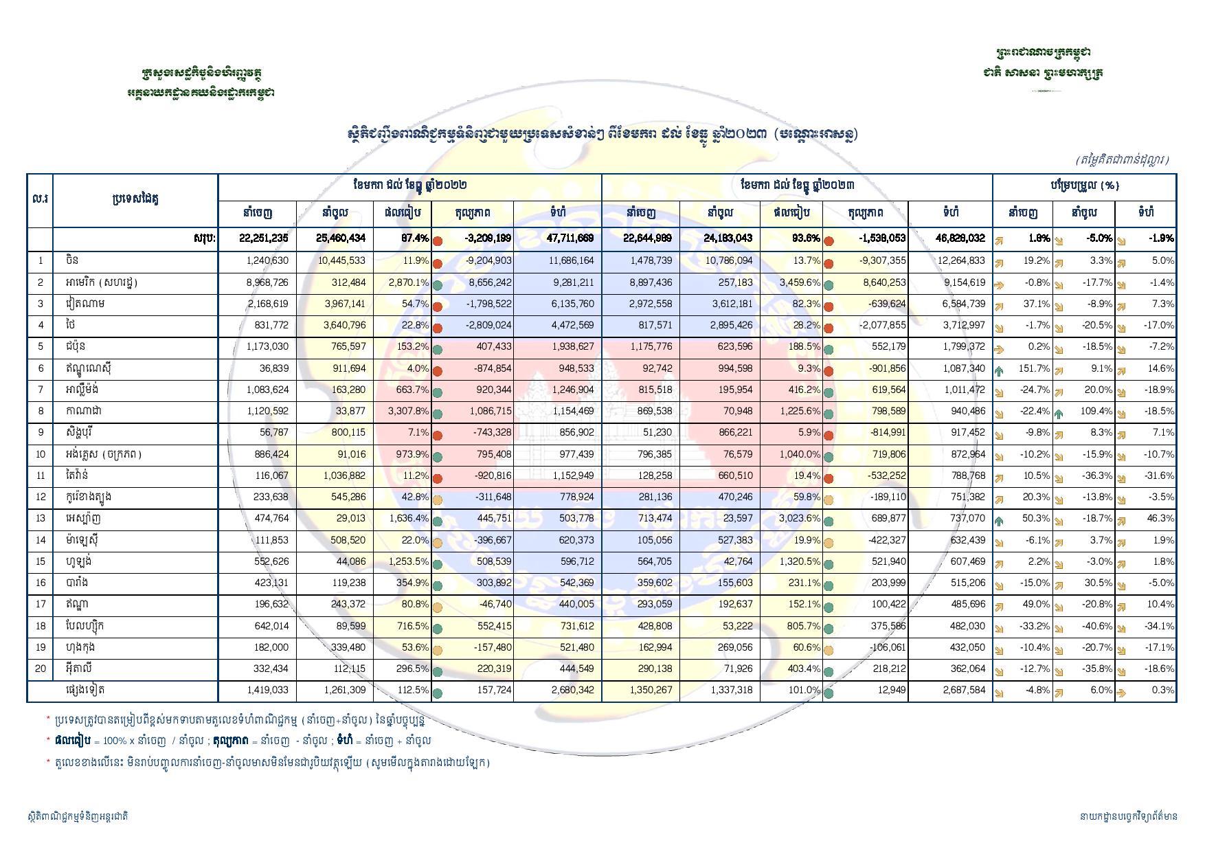 ដោយឡែកចំពោះការនាំចូលវិញ បើតាមរបាយការណ៍បានបង្ហាញថា កម្ពុជានាំចូលទំនិញក្នុងបរិមាណចំនួន ២៤,១៨៣,០៤៣,០០០ដុល្លារ ធ្លាក់ចុះ ៥ភាគរយ បើធៀបនឹងឆ្នាំ២០២២ ចំនួន ២៥,៤៦០,៤៣៤,០០០ដុល្លារ។