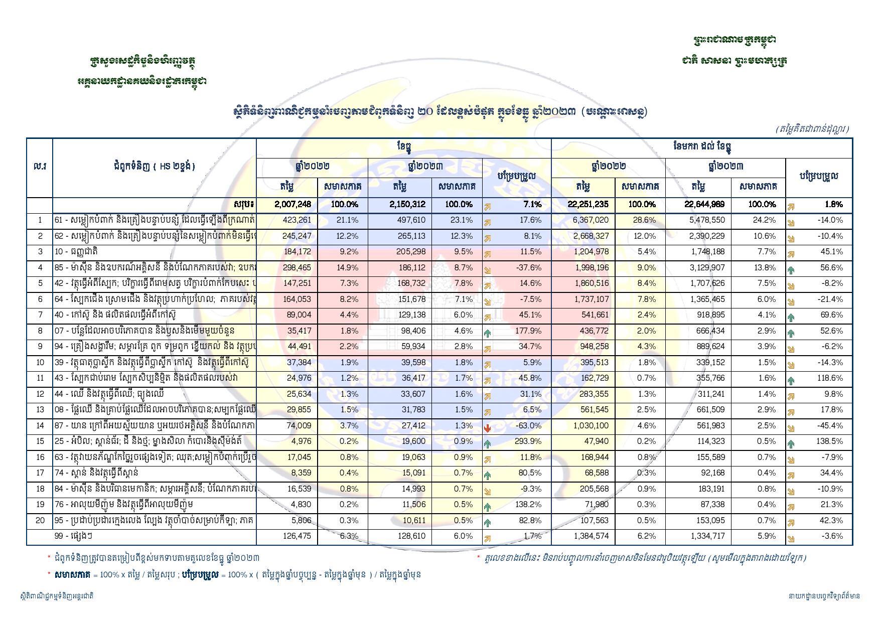របាយការណ៍របស់អគ្គនាយកដ្ឋានគយ និងរដ្ឋាករកម្ពុជា បានឲ្យដឹងទៀតថា ពេញមួយឆ្នាំ២០២៣នេះ កម្ពុជានាំចេញទំនិញទៅផ្សារអន្តរជាតិ មានទឹកប្រាក់ចំនួន ២២,៦៤៤,៩៨៩,០០០ដុល្លារកើនឡើង១.៨ភាគរយ បើធៀបនឹងរយៈពេលដូចគ្នា ឆ្នាំ២០២២ មានទឹកប្រាក់ ២២,២៥១,២៣៥,០០០ដុល្លារ។