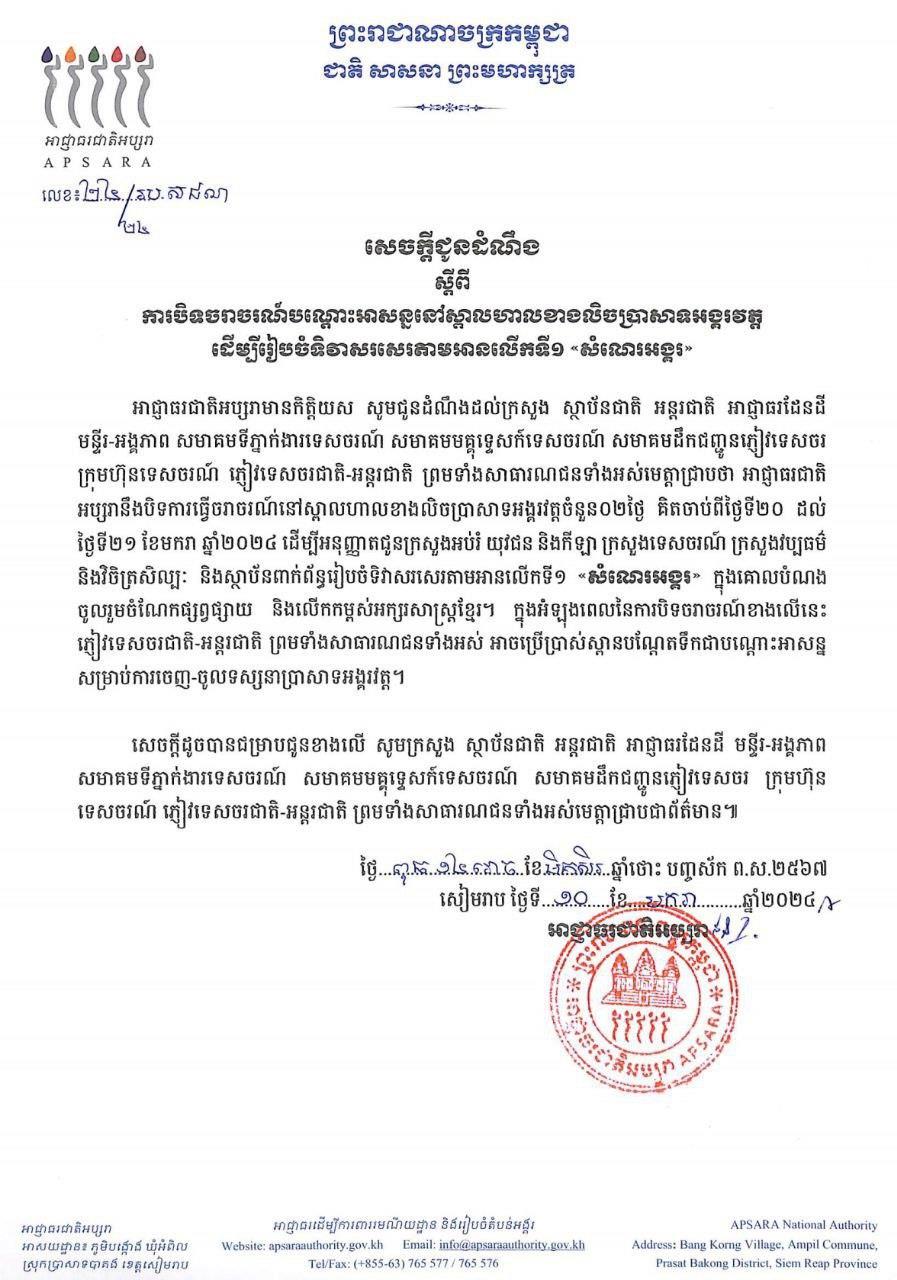 អាជ្ញាធរជាតិអប្សរា ជូនដំណឹងពីការបិទចរាចរណ៍នៅស្ពានហាលខាងលិចប្រាសាទអង្គរវត្ត ដើម្បីរៀបចំកម្មវិធី «សំណេរអង្គរ» រយៈពេល២ថ្ងៃ