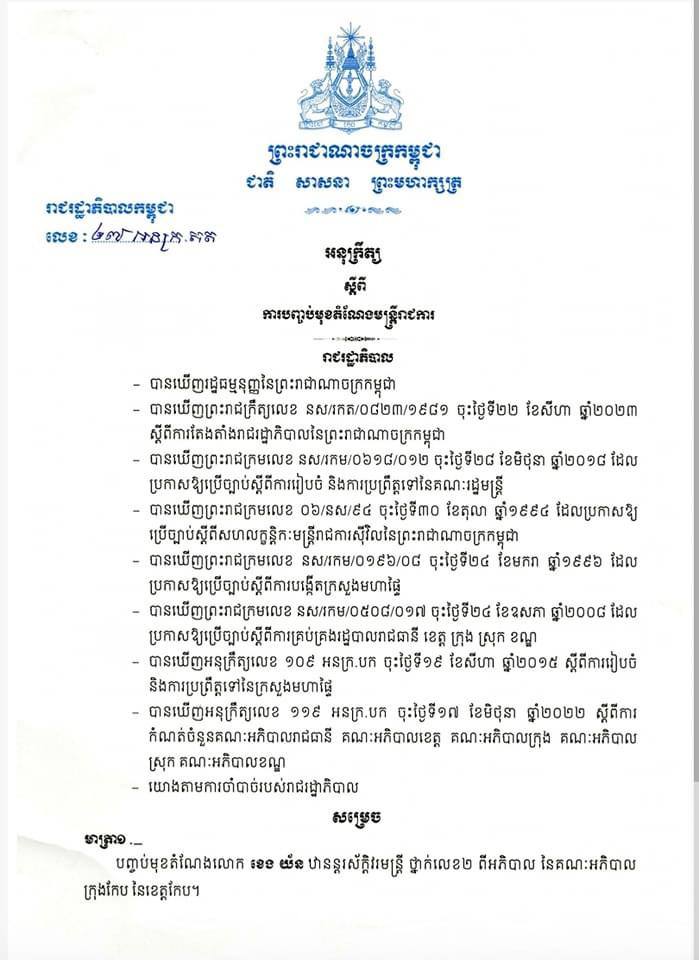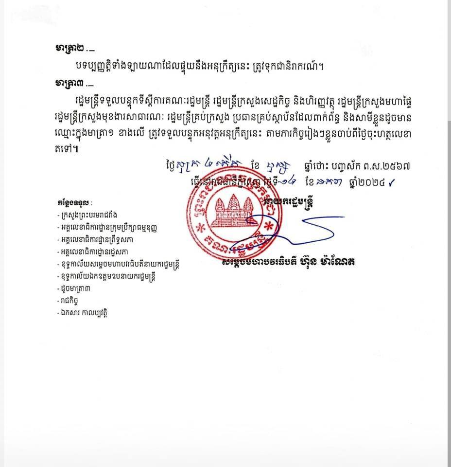 សម្តេចធិបតី ហ៊ុន ម៉ាណែត បានបង្ហោះអនុក្រឹត្យបញ្ចប់មុខតំណែង ជាមួយនឹងខ្លឹមសារទាំងស្រុងដូចខាងក្រោម៖