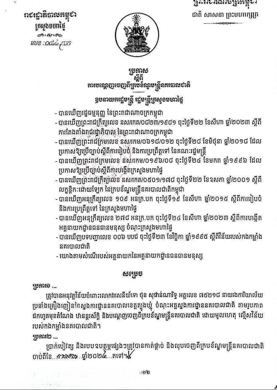 (ភ្នំពេញ)៖ លោកអភិសន្ដិបណ្ឌិត ស សុខា ឧបនាយករដ្ឋមន្ដ្រី រដ្ឋមន្ដ្រីក្រសួងមហាផ្ទៃ បានចេញប្រកាសបណ្ដេញលោកវរសេនីយ៍ទោ ថុន សុផាន់ណារិទ្ធ នាយរងការិយាល័យប្រឆាំងគ្រឿងញៀន នៃស្នងការដ្ឋានគរបាលខេត្តត្បូងឃ្មុំ ចេញពីក្របខ័ណ្ឌមន្ដ្រីនគរបាលជាតិ។