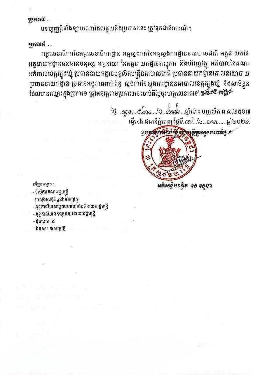 ខាងក្រោមនេះ ជាប្រកាសរបស់រដ្ឋមន្ដ្រីក្រសួងមហាផ្ទៃ៖