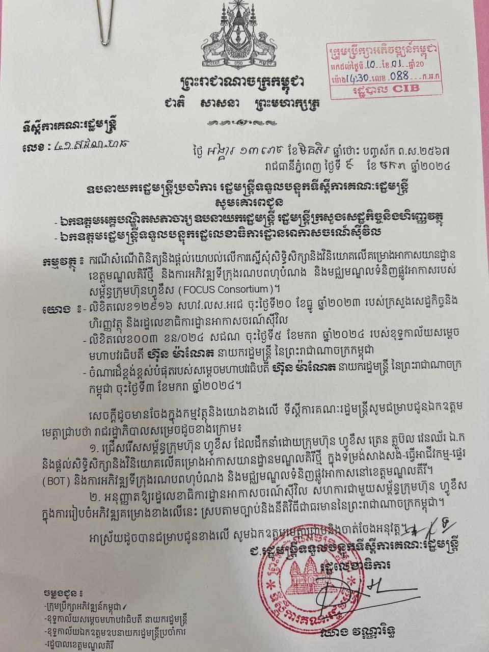 រាជរដ្ឋាភិបាលអនុញ្ញាតឱ្យក្រុមហ៊ុនមួយ សិក្សាគម្រោងវិនិយោគព្រលានយន្តហោះ និងទីក្រុងរណបនៅខេត្តមណ្ឌលគិរី