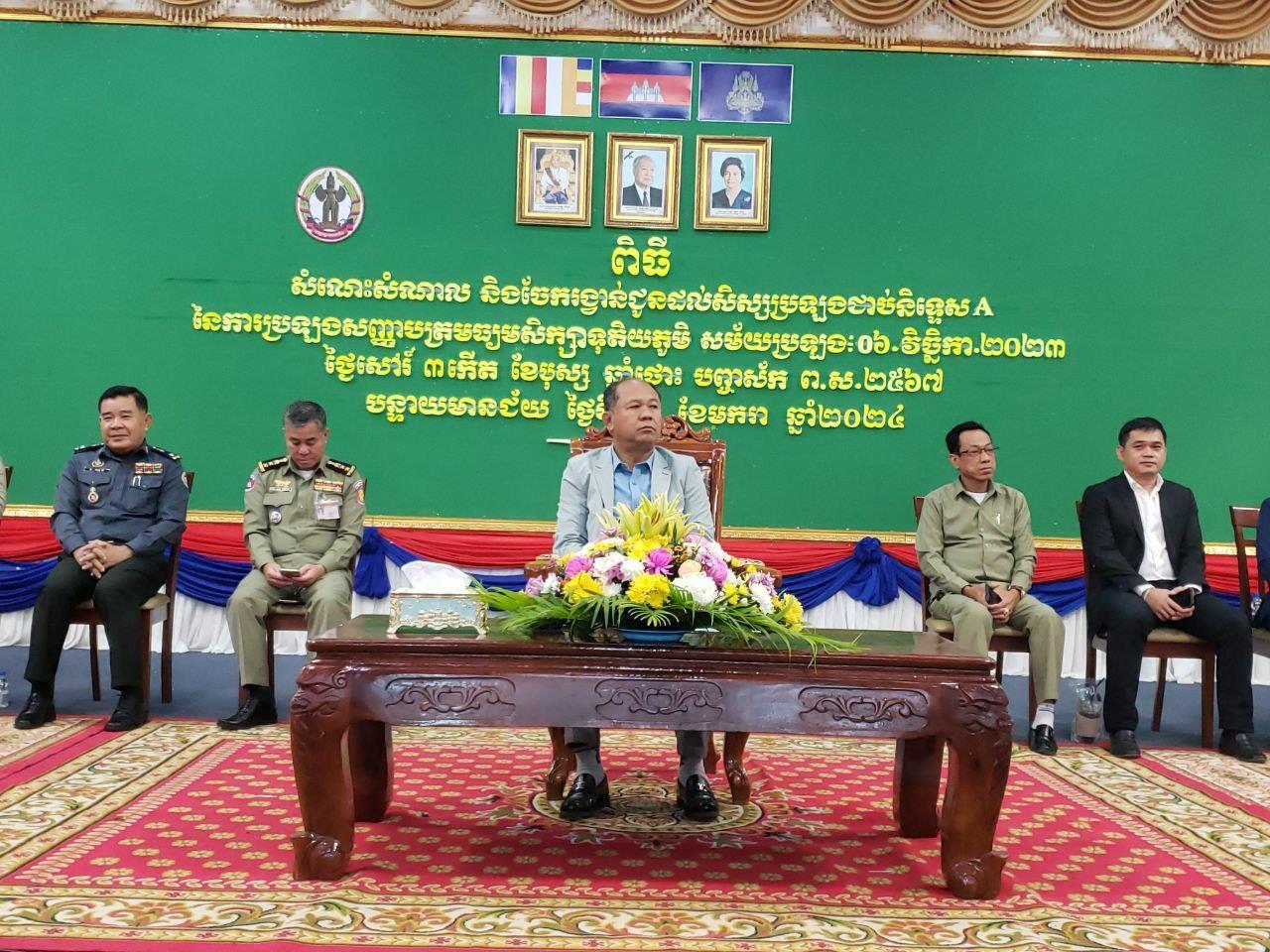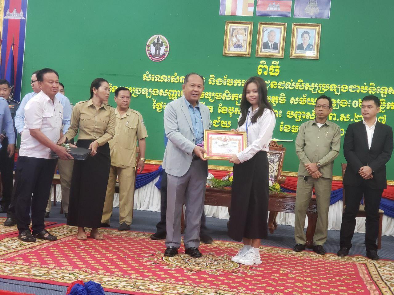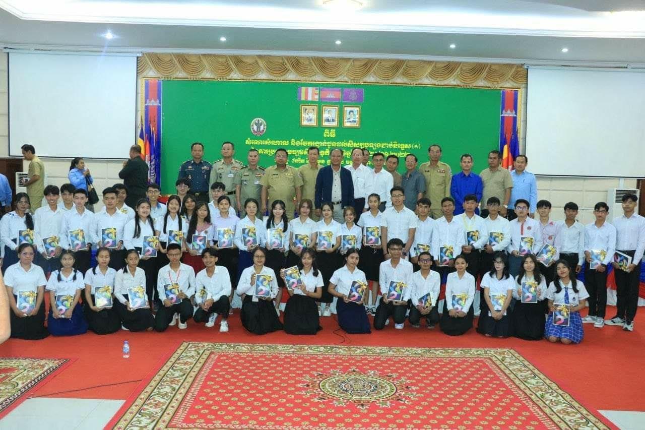 (បន្ទាយមានជ័យ)៖ នៅព្រឹកថ្ងៃទី១៣ ខែមករា ឆ្នាំ២០២៤ លោក អ៊ុំ រាត្រី អភិបាលខេត្តបន្ទាយមានជ័យ បានចែករង្វាន់លើកទឹកចិត្តដល់សិស្ស បានប្រឡងសញ្ញាបត្រមធ្យមសិក្សាទុតិយភូមិ នៅខេត្តបន្ទាយមានជ័យ ឆ្នាំ២០២៣ ដែលជាប់និទ្ទេស A ចំនួន៨២នាក់ ដោយម្នាក់ៗទទួលបានកុំព្យូទ័រយួដៃ១គ្រឿង។