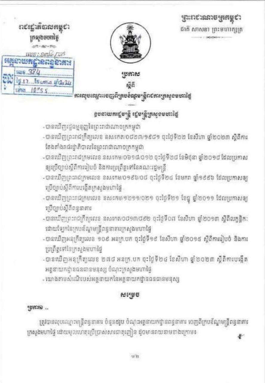 (ភ្នំពេញ)៖ លោកអភិសន្តិបណ្ឌិត ស សុខា ឧបនាយករដ្ឋមន្រ្តី រដ្ឋមន្រ្តីក្រសួងមហាផ្ទៃ បានចេញនូវសេចក្តីប្រកាស លុបឈ្មោះមន្ត្រីពន្ធនាគារចំនួន៥រូប ចំណុះអគ្គនាយកដ្ឋានពន្ធនាគារ ចេញពីក្របខ័ណ្ឌក្រសួងមហាផ្ទៃ ដោយមូលហេតុប្រើប្រាស់គ្រឿងញៀន។