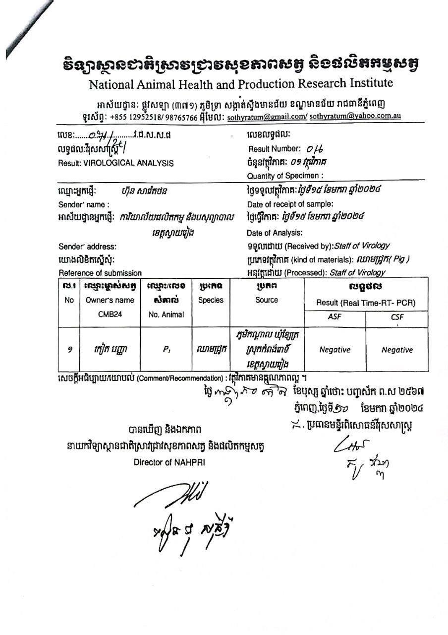 របាយការណ៍បានបញ្ជាក់ថា យោងតាមលទ្ធផលនៃការវិភាគសំណាក លេខ ០៧១/២៤ វ.ជ.ស.ស.ជ ចុះថ្ងៃទី១៦ ខែមករា ឆ្នាំ២០២៤ របស់វិទ្យាស្ថានជាតិស្រាវជ្រាវសុខភាពសត្វ និងផលិតកម្មសត្វ នៃអគ្គនាយកដ្ឋានសុខភាពសត្វ និងផលិតកម្មសត្វ សត្វជ្រូកឈឺ និងងាប់នៅតាមភូមិឃុំខាងលើ ពុំមានផ្ទុកនូវវីរុសជំងឺប៉េស្តជ្រូកអាហ្វិ្រក ឬជំងឺរាគកូនជ្រូក ដែលជាប្រភេទ ជំងឺឆ្លងកាច សាហាវ ធ្ងន់ធ្ងរគ្មានថ្នាំព្យាបាលនោះទេ។ ផ្នែកតាមលទ្ធផល នៃការអង្កេតតាមដានជាក់ស្តែងនៅគ្រប់តំបន់ដែលកើតហេតុ និងតំបន់ដែលមានការ សង្ស័យរបស់មន្ត្រីជំនាញ នៃមន្ទីរកសិកម្មរុក្ខាប្រមាញ់ និងនេសាទខេត្ត និងមន្ត្រីជំនាញ នៃអគ្គនាយកដ្ឋានសុខភាព សត្វ និងផលិតកម្មស សត្វ គិតត្រឹមថ្ងៃទី១៥ ខែមករា ឆ្នាំ២០២៤នេះ សត្វជ្រូកនៅតំបន់ខាងលើពុំមានជំងឺប៉េស្តជ្រូក (CSF) និងជំងឺប៉េស្តជ្រូកអាហ្វ្រិក (ASF) ទេ៕ ផ្តល់សិទ្ធិដោយ៖ freshnews