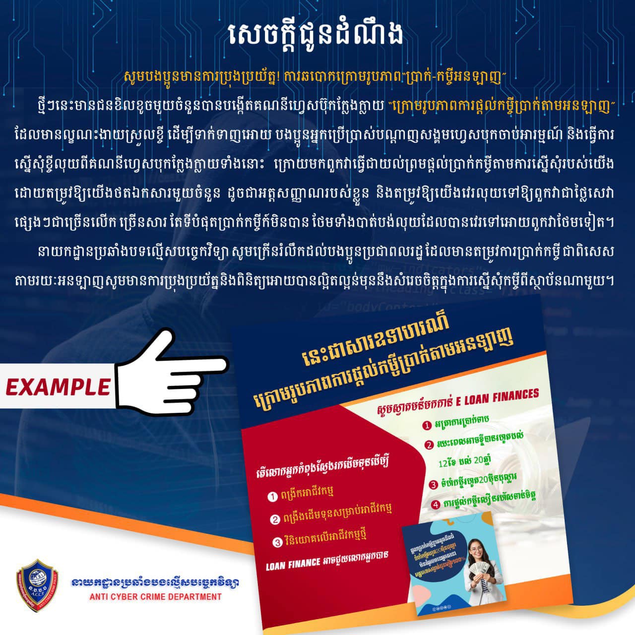 នាយកដ្ឋានប្រឆាំងបទល្មើសបច្ចេកវិទ្យា បានឱ្យដឹងថា ថ្មីៗនេះមានជនខិលខូចមួយចំនួនបានបង្កើតគណនីហ្វេសប៊ុកក្លែងក្លាយ “ក្រោមរូបភាពការផ្តល់កម្ចីប្រាក់តាមអនឡាញ” ដែលមានលក្ខណៈងាយស្រួលខ្ចី ដើម្បីទាក់ទាញអោយ បងប្អូនអ្នកប្រើប្រាស់បណ្តាញសង្គមហ្វេសបុកចាប់អារម្មណ៍ និងធ្វើការស្នើសុំខ្ចីលុយពីគណនីហ្វេសបុកក្លែងក្លាយទាំងនោះ ក្រោយមកពួកវាធ្វើជាយល់ព្រមផ្តល់ប្រាក់កម្ចីតាមការស្នើសុំរបស់យើង ដោយតម្រូវឱ្យយើងថតឯកសារមួយចំនួន ដូចជាអត្តសញ្ញាណរបស់ខ្លួន និងតម្រូវឱ្យយើងវេរលុយទៅឱ្យពួកវាជាថ្លៃសេវាផ្សេងៗជាច្រើនលើក ច្រើនសារ តែទីបំផុតប្រាក់កម្ចីក៏មិនបាន ថែមទាំងបាត់បង់លុយដែលបានវេរទៅអោយពួកវាថែមទៀត។