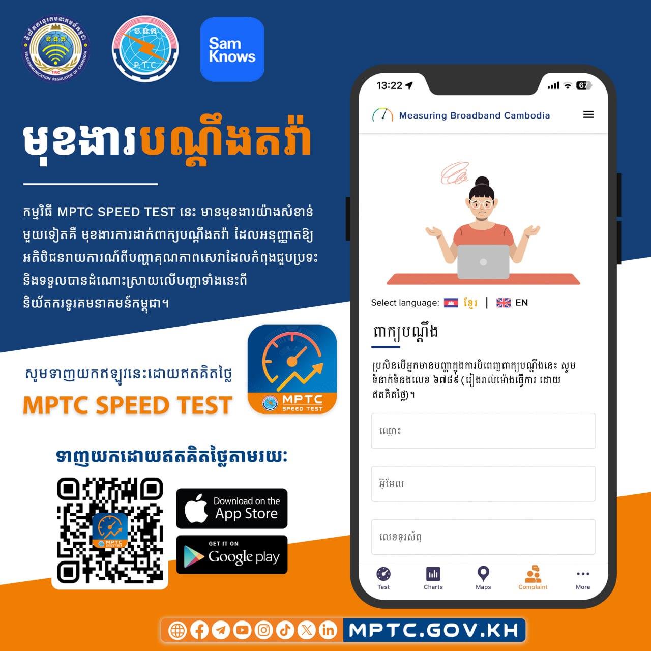 ក្រសួងប្រៃសណីយ៍ និងទូរគមនាគមន៍ ប្រាប់ពីរបៀបការប្រើប្រាស់មុខងារបណ្ដឹងតវ៉ា ក្នុងកម្មវិធីវាស់ស្ទង់ល្បឿនអ៊ីនធឺណិត MPTC Speed Test