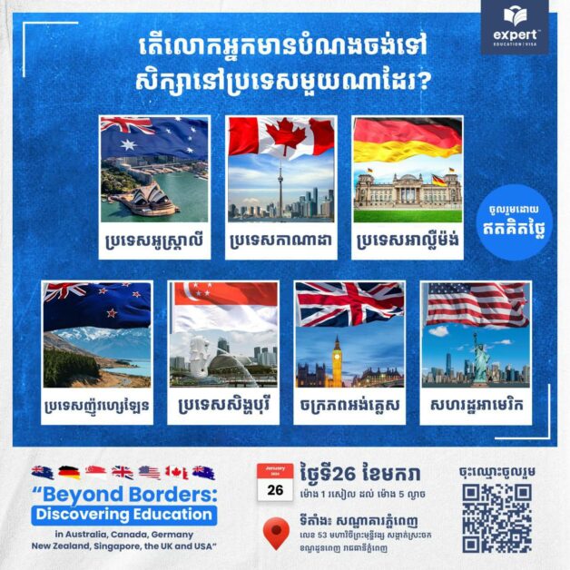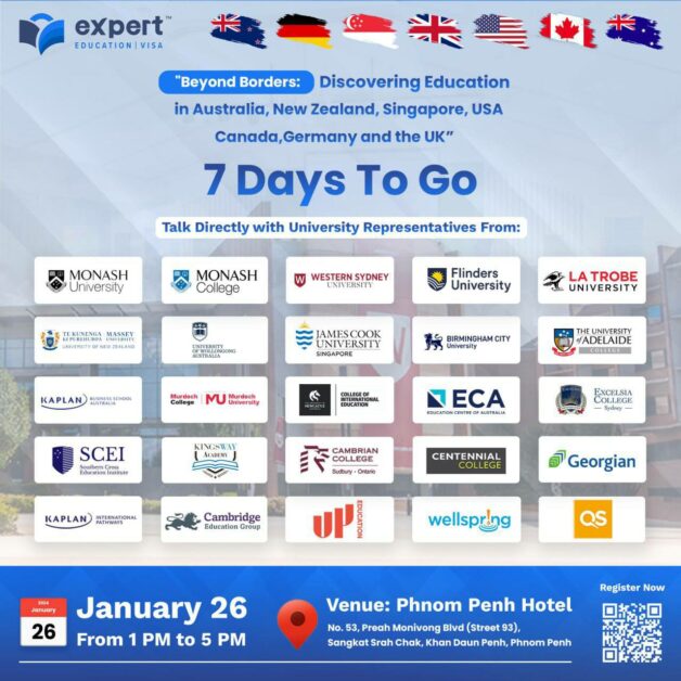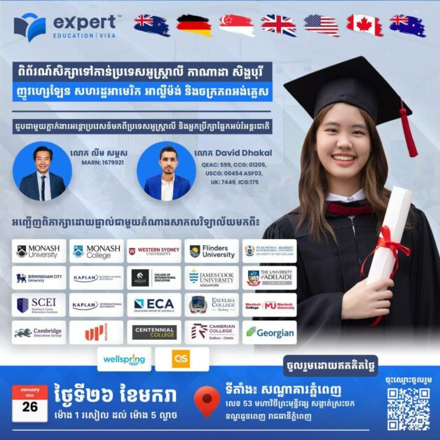 ក្រុមហ៊ុន Expert Education នឹងរៀបចំកម្មវិធី «ពិព័រណ៍ការសិក្សាទៅកាន់ប្រទេសអូស្ត្រាលី កាណាដា សិង្ហបុរី នូវែលហ្សេឡង់ សហរដ្ឋអាមេរិក អាល្លឺម៉ង់ និងចក្រភពអង់គ្លេស» នៅចុងខែមករាខាងមុខនេះ