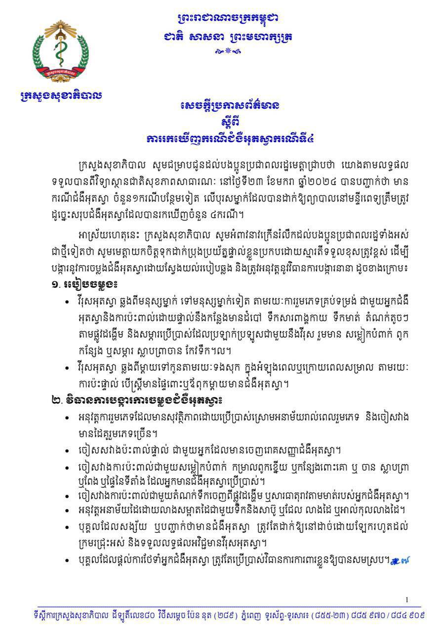 ក្រសួងសុខាភិបាល ចេញសេចក្តីប្រកាសព័ត៌មាន ស្តីពីការរកឃើញករណីជំងឺអុតស្វាករណីទី៤