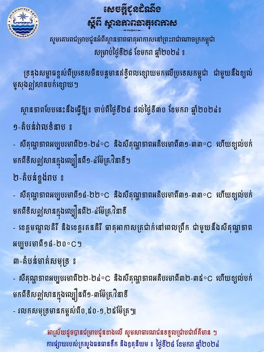 ក្រសួងធនធានទឹក ជូនដំណឹងពីស្ថានភាពធាតុអាកាសនៅកម្ពុជា សម្រាប់ថ្ងៃទី២៨ ខែមករា ឆ្នាំ២០២៤