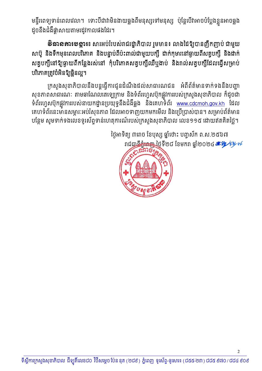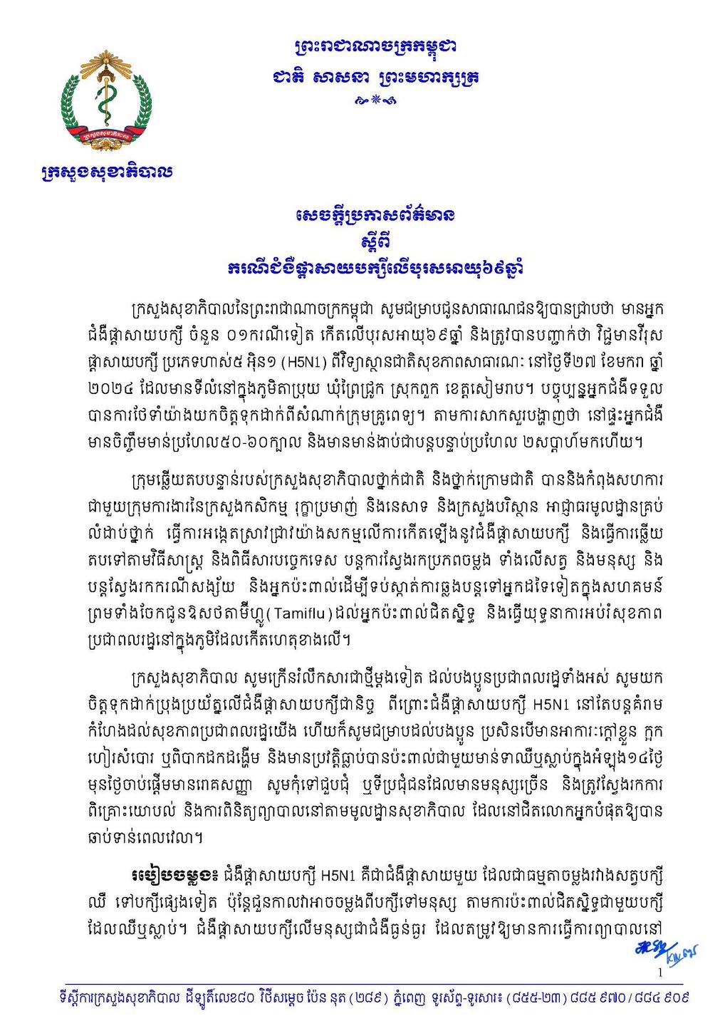 ក្រសួងសុខាភិបាល ចេញសេចក្តីប្រកាសព័ត៌មាន ស្តីពីករណីជំងឺផ្តាសាយបក្សីលើបុរសអាយុ៦៩ឆ្នាំ