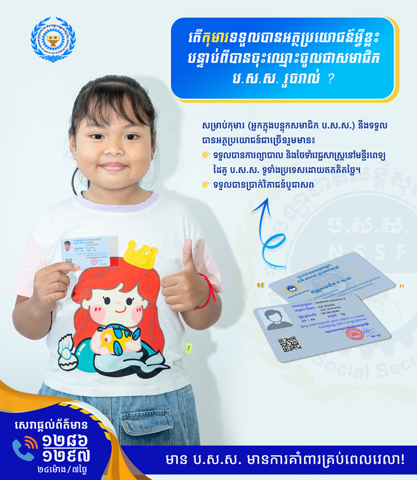 (ភ្នំពេញ)៖ លោក ហេង សុផាន់ណារិទ្ធ អគ្គនាយករងបេឡាជាតិសន្តិសុខសង្គម នៃក្រសួងការងារ និងបណ្តុះបណ្តាលវិជ្ជាជីវៈ នៅថ្ងៃទី៣១ ខែមករា ឆ្នាំ២០២៤ បានលើកឡើងថា សម្រាប់កុមារ «អ្នកក្នុងបន្ទុកសមាជិក ប.ស.ស.» នឹងទទួលបានអត្ថប្រយោជន៍ជាច្រើនពេលក្លាយជាសមាជិក ប.ស.ស.។