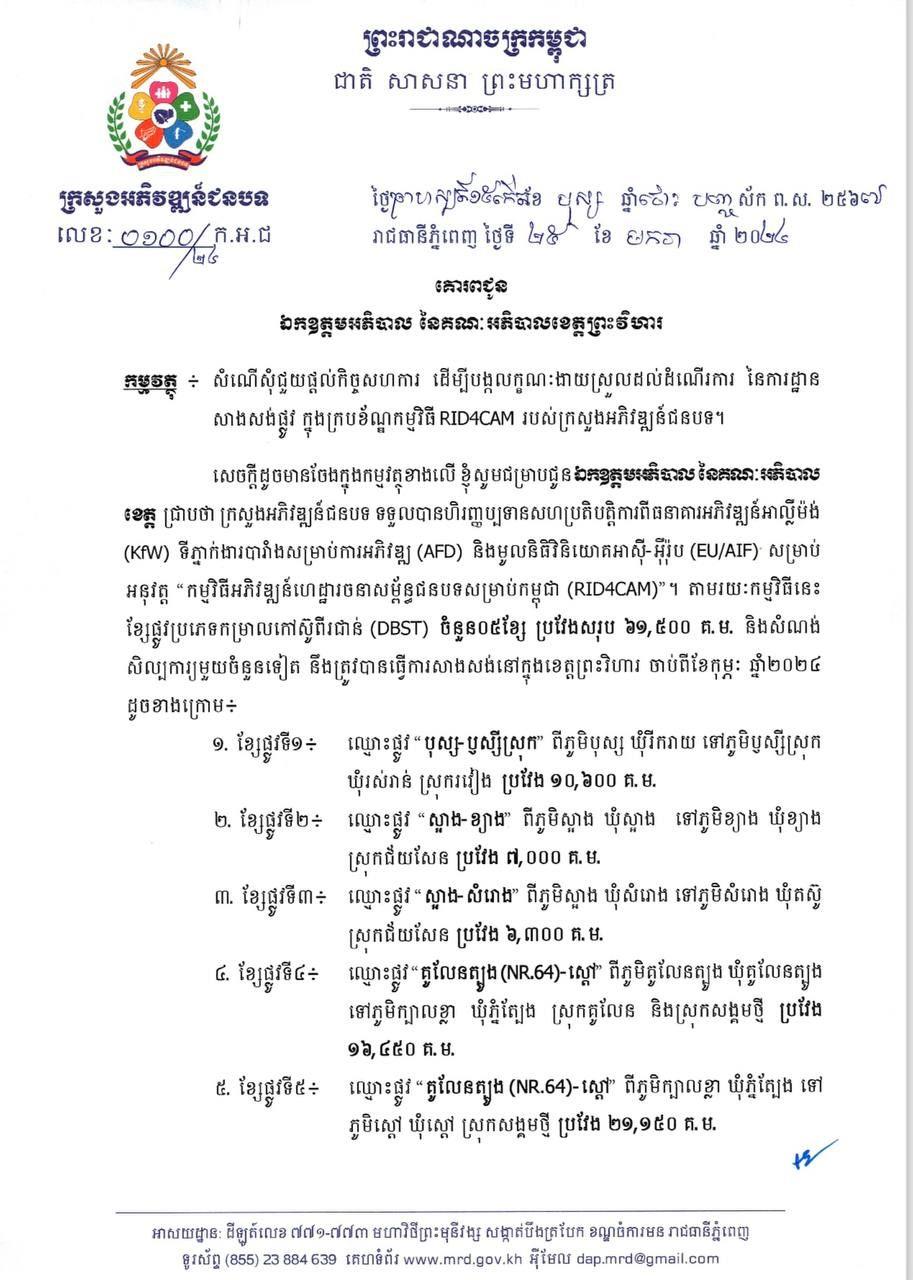 (ព្រះវិហារ)៖ ផ្លូវក្រាលកៅស៊ូ ២ស្រទាប់ស្តើង ប្រភេទ (DBST) ចំនួន៥ខ្សែមានប្រវែងសរុប ៦១.៥០០គីឡូម៉ែត្រ និងសំណង់សិល្បការមួយចំនួនទៀត នឹងត្រូវបានសាងសង់នៅខេត្តព្រះវិហារ ចាប់ពីខែកុម្ភៈ ឆ្នាំ២០២៤តទៅ។