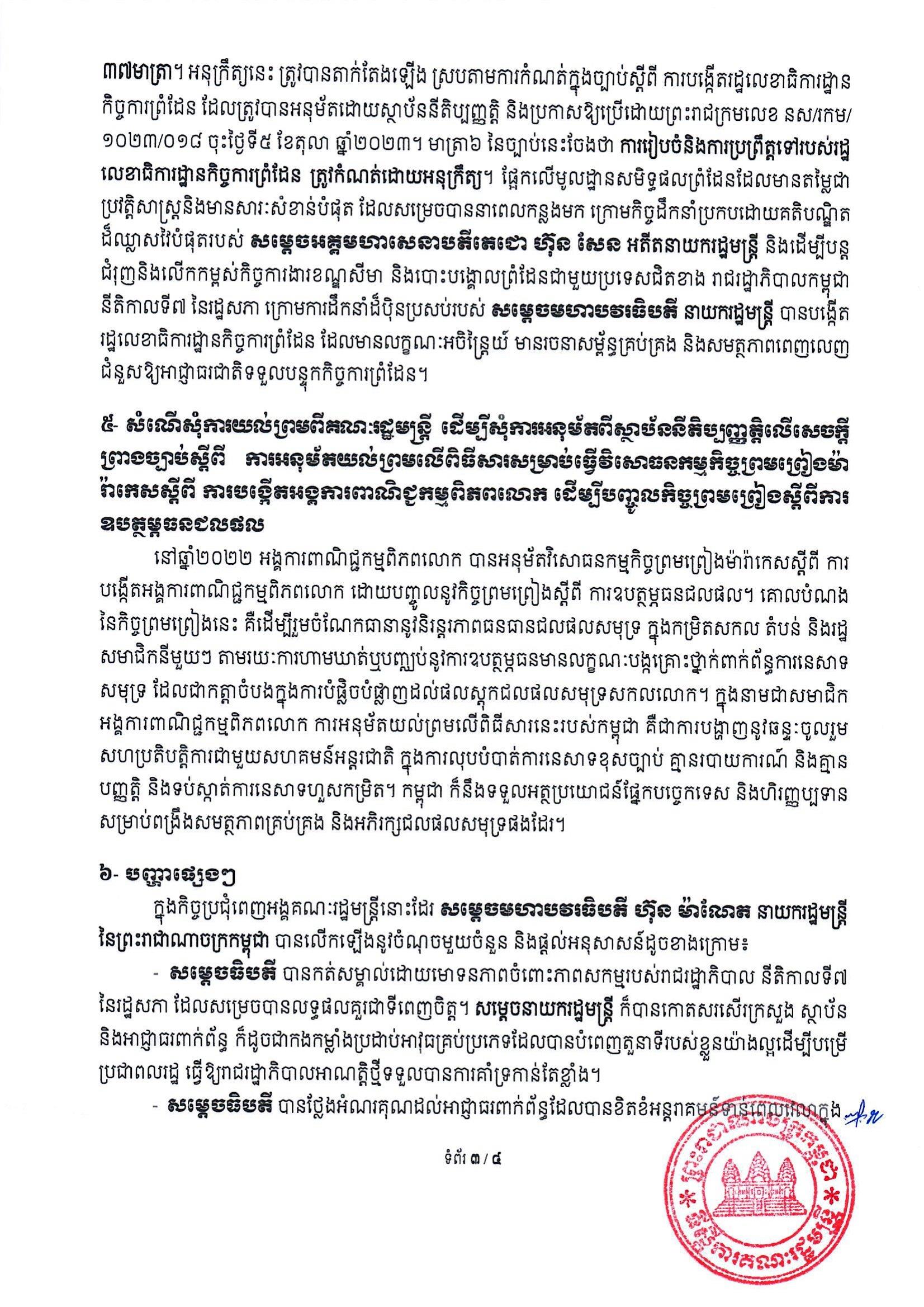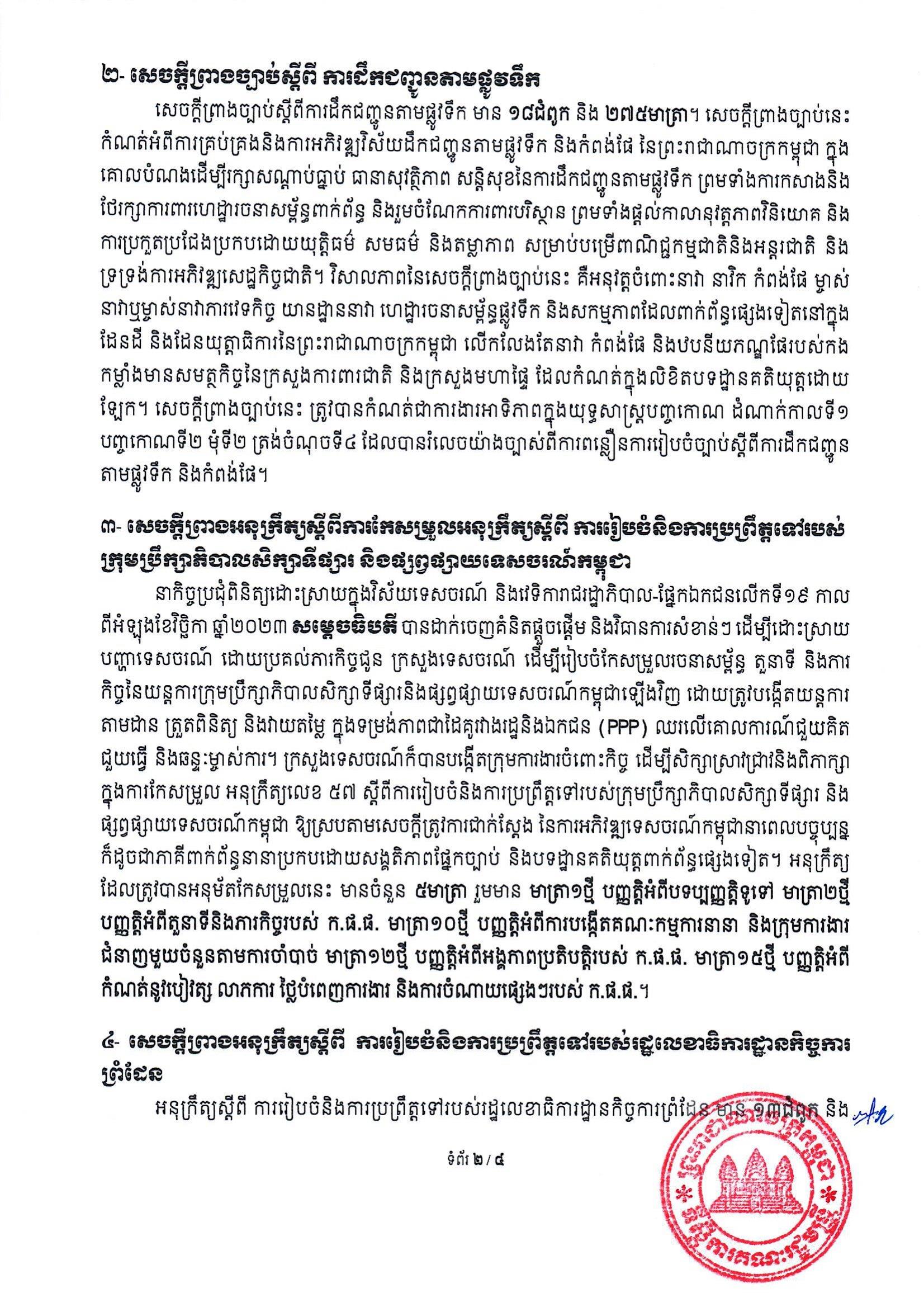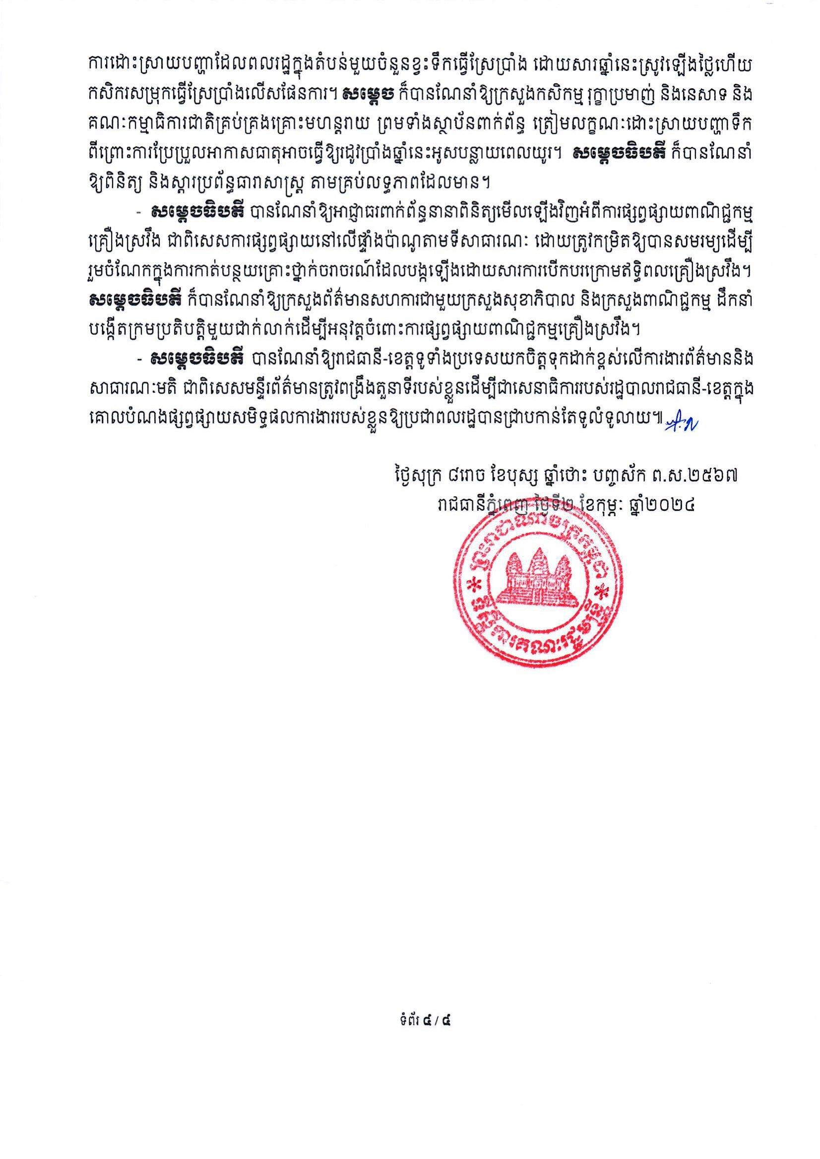 សេចក្តីប្រកាសព័ត៌មាន ស្តីពីលទ្ធផលកិច្ចប្រជុំគណៈរដ្ឋមន្ត្រី បានបញ្ជាក់យ៉ាងដូច្នេះថា «សម្ដេចធិបតី បានណែនាំឱ្យអាជ្ញាធរពាក់ព័ន្ធនានាពិនិត្យមើលឡើងវិញអំពីការផ្សព្វផ្សាយពាណិជ្ជកម្មគ្រឿងស្រវឹង ជាពិសេសការផ្សព្វផ្សាយនៅលើផ្ទាំងប៉ាណូតាមទីសាធារណៈ ដោយត្រូវកម្រិតឱ្យបានសមរម្យដើម្បីរួមចំណែកក្នុងការកាត់បន្ថយគ្រោះថ្នាក់ចរាចរណ៍ ដែលបង្កឡើងដោយសារការបើកបរក្រោមឥទ្ធិពលគ្រឿងស្រវឹង»។
