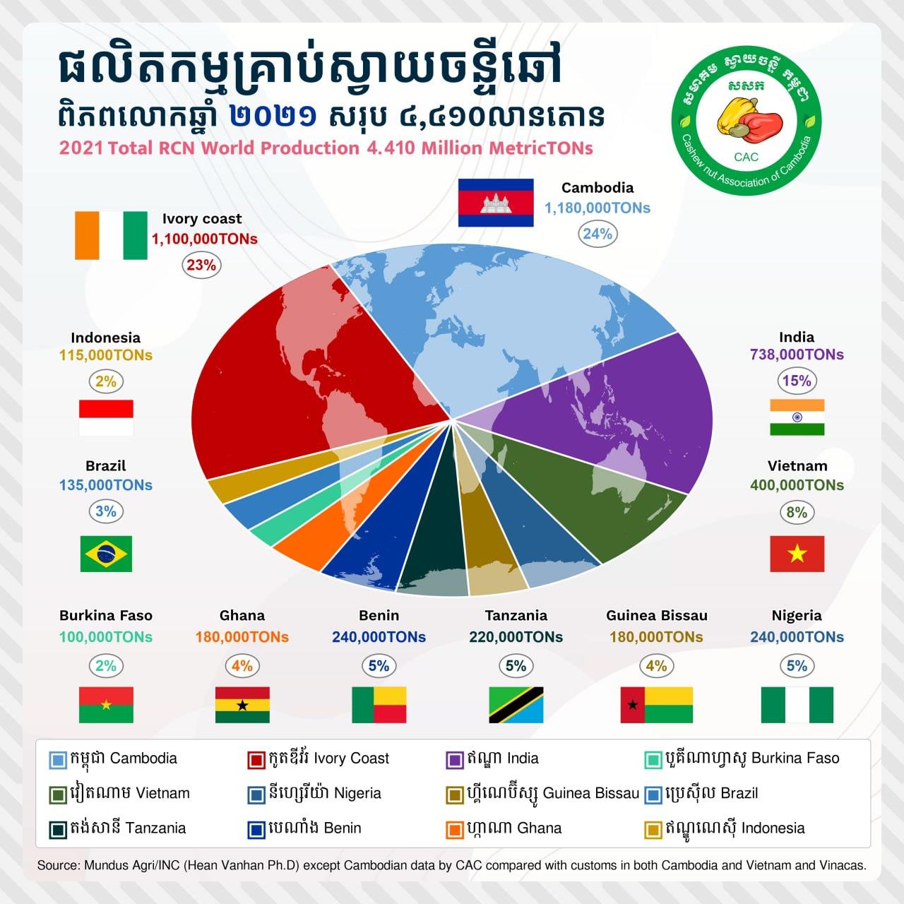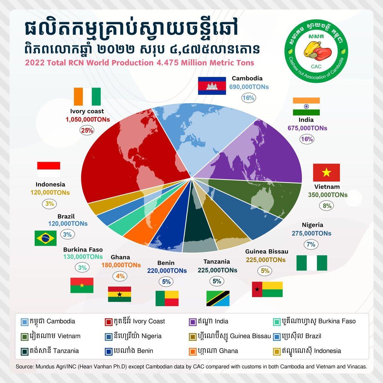 លោកបានឱ្យដឹងថា នៅឆ្នាំ២០២៣ កម្ពុជាផលិតគ្រាប់ស្វាយចន្ទីបានប្រមាណជាង ៦៥ម៉ឺនតោន ដែលបង្ហាញថា ការផលិតស្វាយចន្ទីរបស់កម្ពុជា មានចំនួនធំនៅលំដាប់ទី ៣ក្នុងពិភពលោក។ ចំណែកប្រទេសឈរនៅលំដាប់លេខ១ គឺប្រទេសកូឌីវ័រ និងទី២ គឺប្រទេសឥណ្ឌា។