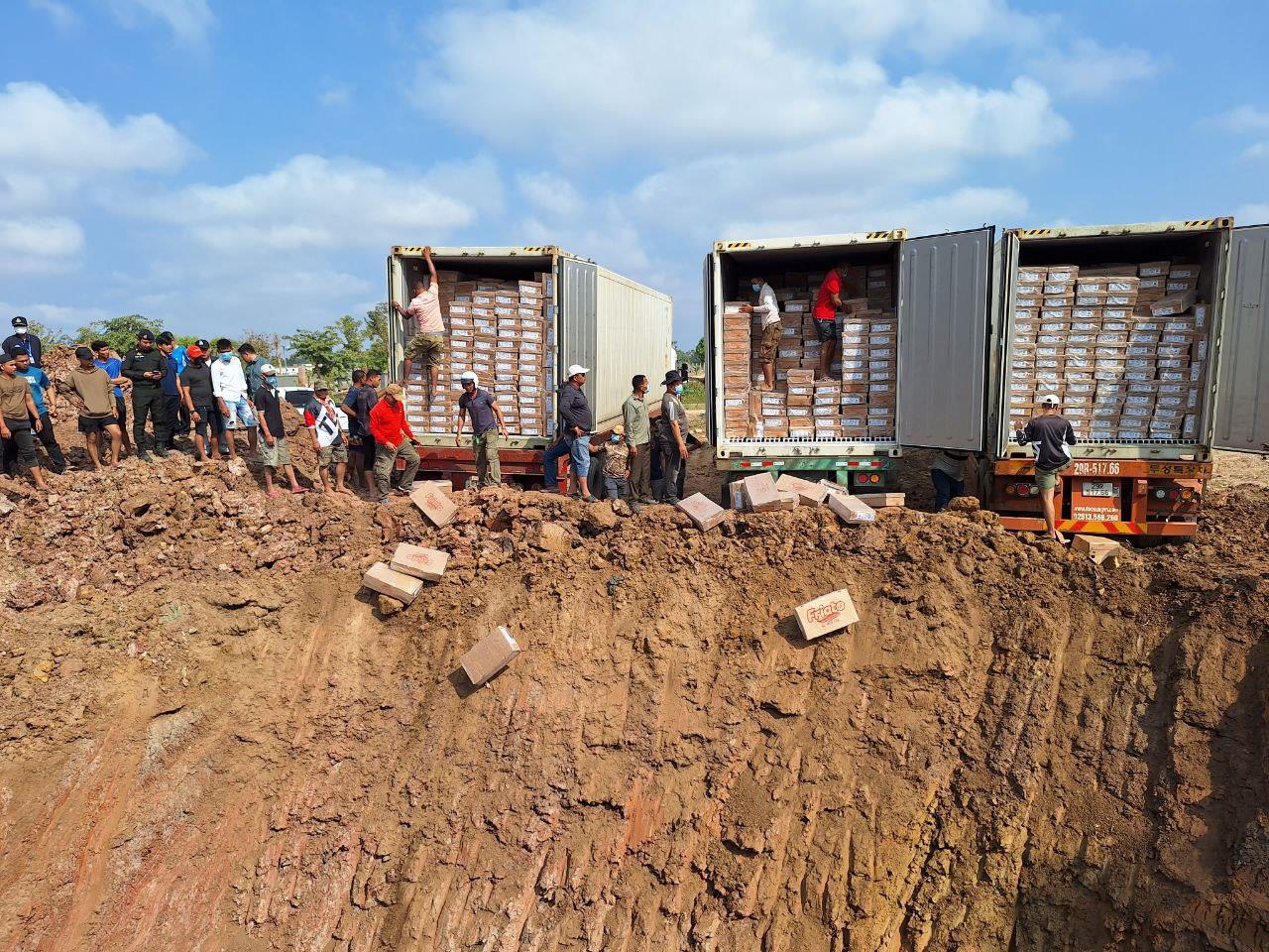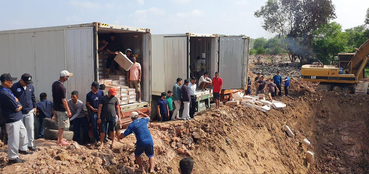 ជើងមាន់គ្មានច្បាប់នាំចូលចំនួន ៤កុងតឺន័រ ដែលមន្ត្រីជំនាញបង្ក្រាបបាននឹងត្រូវដុតកម្ទេចចោល នៅថ្ងៃទី៤ ខែកុម្ភៈស្អែកនេះ