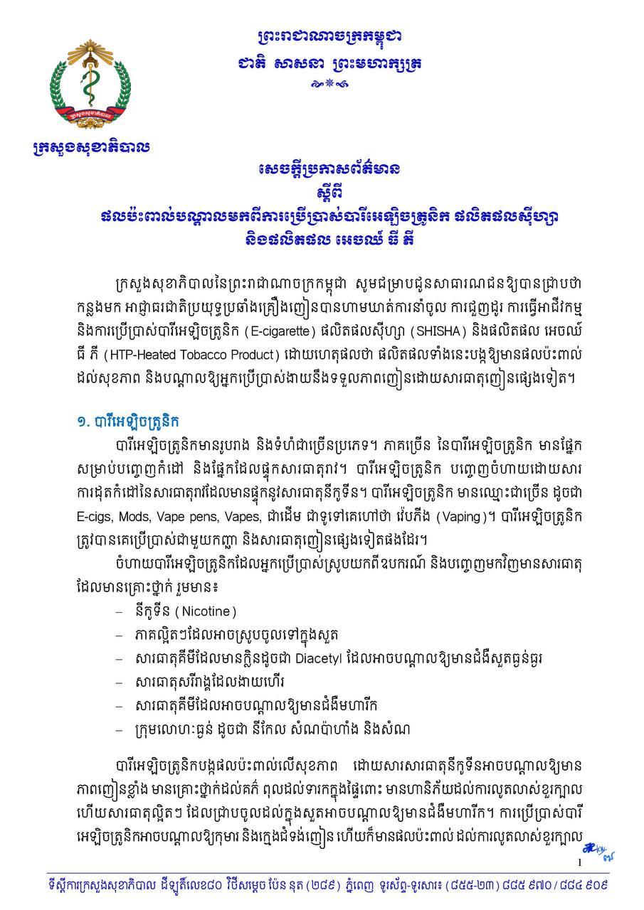 ក្រសួងសុខាភិបាល ចេញសេចក្តីប្រកាសព័ត៌មាន ស្តីពីផលប៉ះពាល់បណ្តាលមកពីការប្រើប្រាស់បារីអេឡិចត្រូនិក ផលិតផលស៊ីហ្សា និងផលិតផល អេចឈ៍ ធី ភី