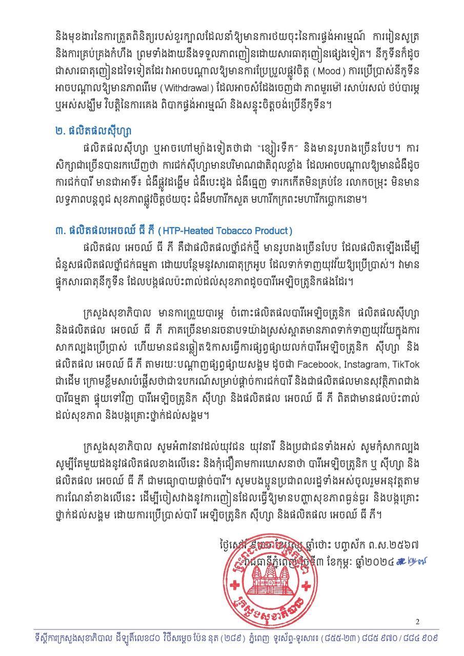(ភ្នំពេញ)៖ ក្រសួងសុខាភិបាល នៅថ្ងៃទី៤ ខែកុម្ភៈ ឆ្នាំ២០២៤ បានចេញសេចក្តីប្រកាសព័ត៌មាន ស្តីពីផលប៉ះពាល់បណ្តាលមកពីការប្រើប្រាស់បារីអេឡិចត្រូនិក ផលិតផលស៊ីហ្សា និងផលិតផល អេចឈ៍ ធី ភី។