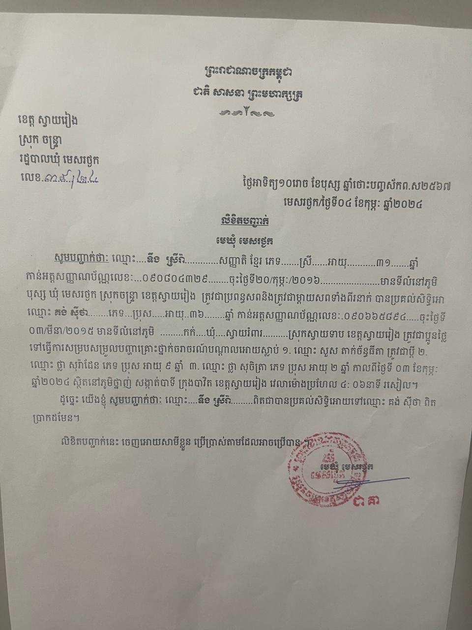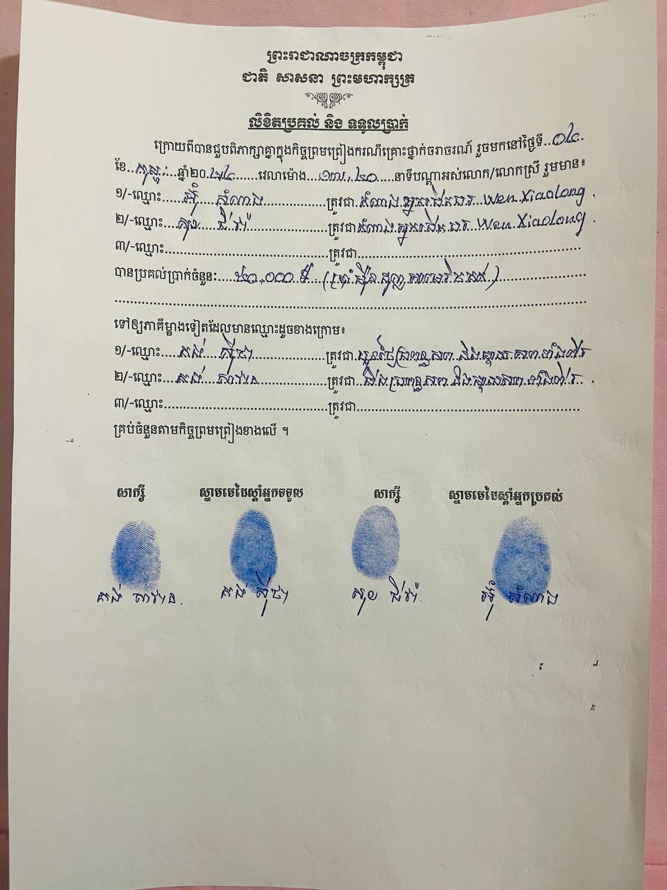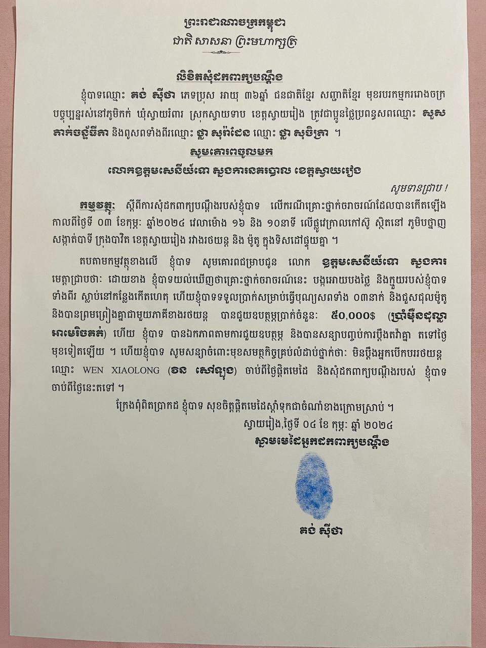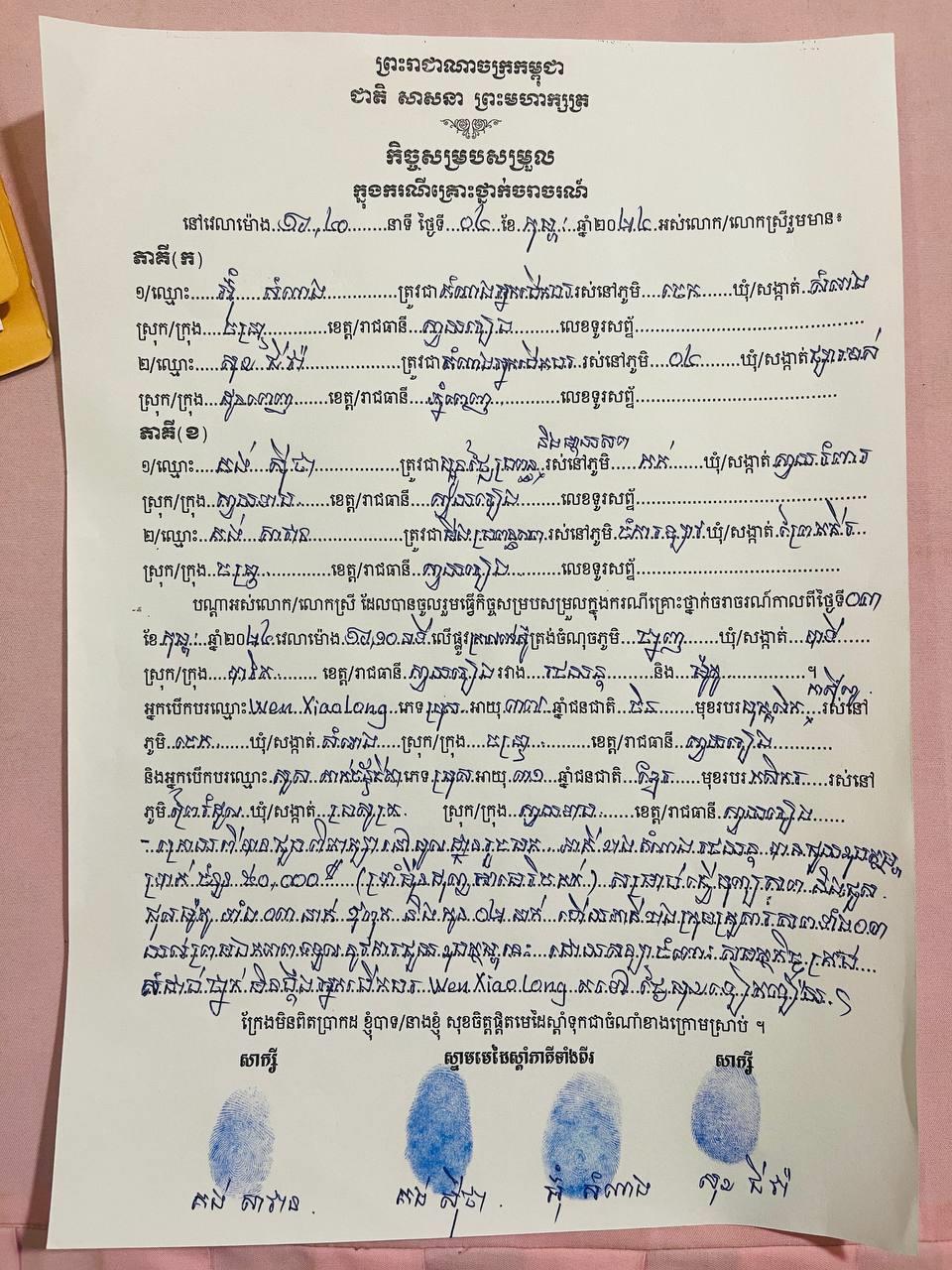 (ស្វាយរៀង)៖ ក្រុមគ្រួសាររបស់ជនរងគ្រោះ៣នាក់ដែលស្លាប់ ក្នុងហេតុការណ៍គ្រោះថ្នាក់ចរាចរណ៍ដែលបង្កដោយជនជាតិចិន បើករថយន្ដបុកនៅខេត្តស្វាយរៀង ទទួលបានសំណងពីភាគីបង្ក ចំនួន៥ម៉ឺនដុល្លារ នៅថ្ងៃទី០៤ ខែកុម្ភៈ ឆ្នាំ២០២៤ម្សិលមិញ និងយល់ព្រមដកពាក្យបណ្ដឹងឈប់ប្ដឹងផ្ដល់។