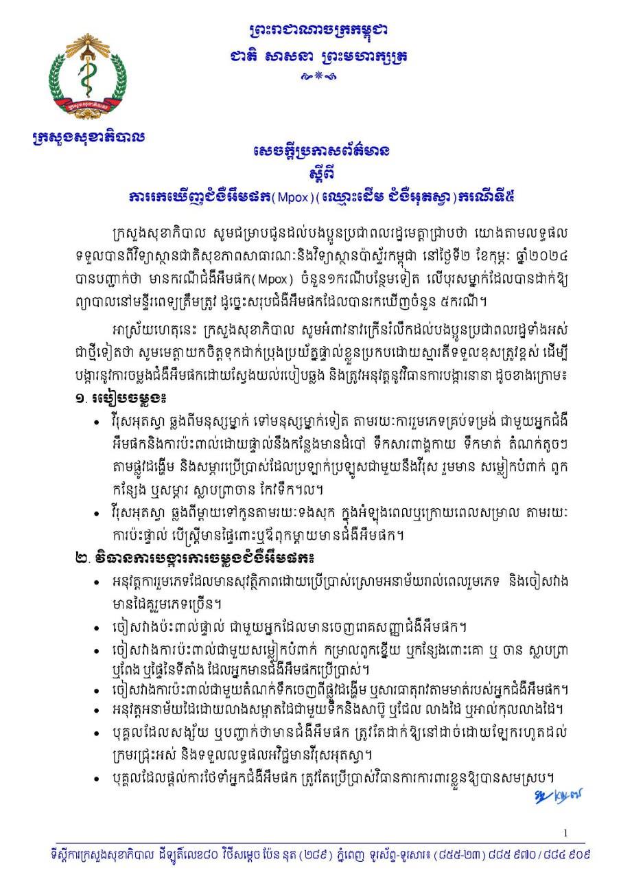 (ភ្នំពេញ)៖ ក្រសួងសុខាភិបាល នៅយប់ថ្ងៃទី៥ ខែកុម្ភៈ ឆ្នាំ២០២៤នេះ បានចេញសេចក្តីប្រកាសព័ត៌មាន ស្តីពីការរកឃើញករណីជំងឺអឹមផត (Mpox) ឈ្មោះដើមជំងឺអុតស្វា ករណីទី៥ ។