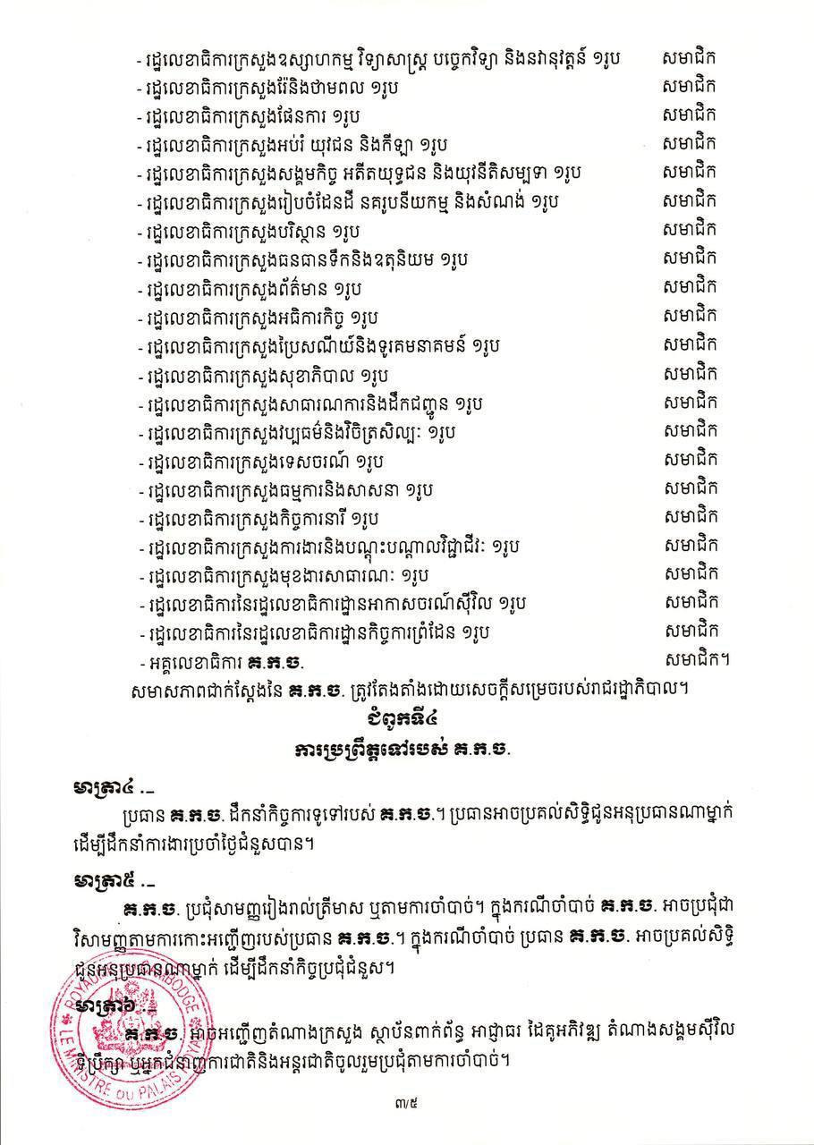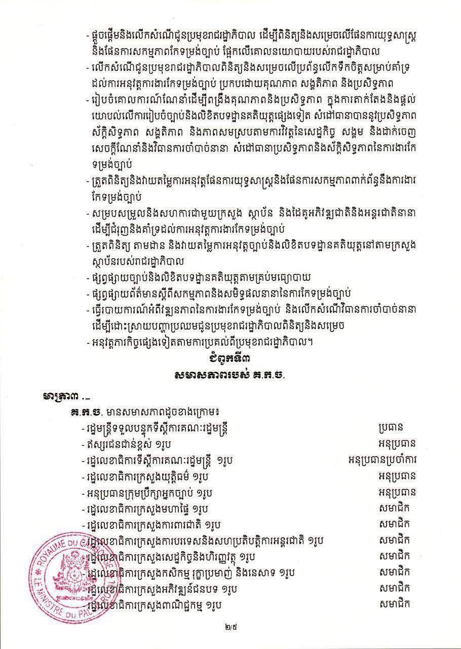 – ត្រួតពិនិត្យ តាមដាន និងវាយតម្លៃការអនុវត្តច្បាប់និងលិខិតបទដ្ឋានគតិយុត្តនៅតាមក្រសួង ស្ថាប័នរបស់រាជរដ្ឋាភិបាល