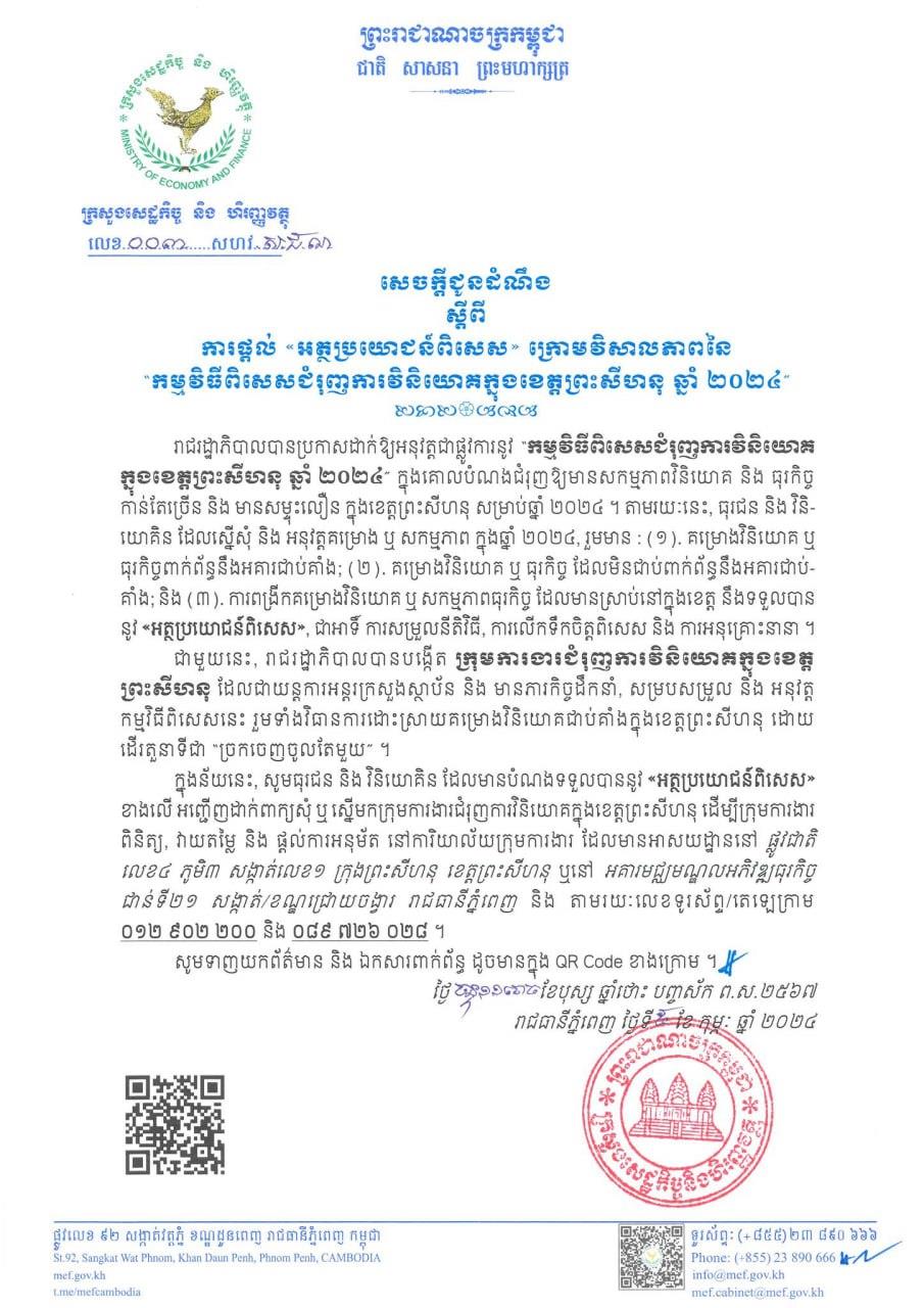 សេចក្ដីជូនដំណឹងបានឲ្យដឹងថា រាជរដ្ឋាភិបាល បានប្រកាសដាក់ឲ្យអនុវត្តជាផ្លូវការនូវ «កម្មវិធីពិសេសជំរុញការវិនិយោគ ក្នុងខេត្តព្រះសីហនុ ឆ្នាំ២០២៤» ក្នុងគោលបំណងជំរុញឲ្យមានសកម្មភាពវិនិយោគ និង ធុរកិច្ចកាន់តែច្រើន និង មានសន្ទុះលឿន ក្នុងខេត្តព្រះសីហនុ សម្រាប់ឆ្នាំ ២០២៤។