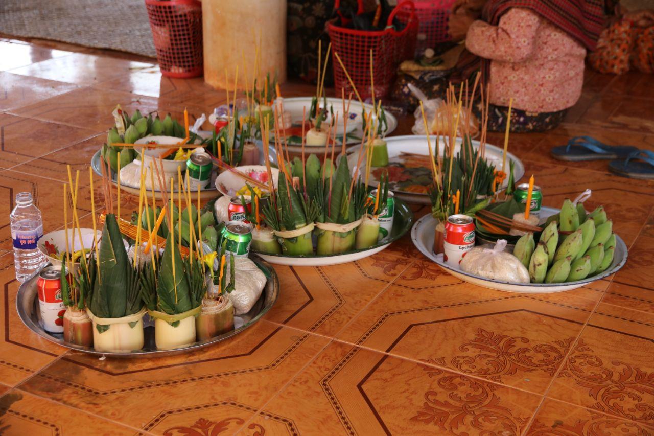 អ្នកភូមិដែលចូលរួមក្នុងពិធីនេះ បាននាំយកម្ហូបអាហារ បាយសម្ល ភេសជ្ជៈ ផ្លែឈើជាដើម ដើម្បីធ្វើពិធីសែន និងថ្វាយនៅតាមរោងអ្នកតា ឬរូបសំណាកដែលអ្នកភូមិគោរព ហើយអ្វីដែលមិនអាចខ្វះបាននោះ គឺនំបញ្ចុក។ ក្រៅពីនោះក៏មានស្លាធម៌ បាយសី មានគ្រឿងសំណែន ទៀន ធូប បារី ខោ អាវផងដែរ។