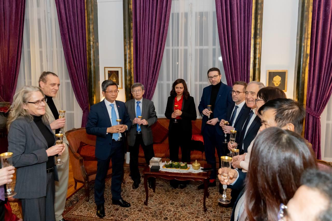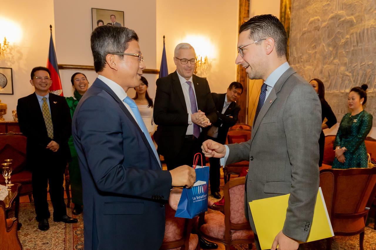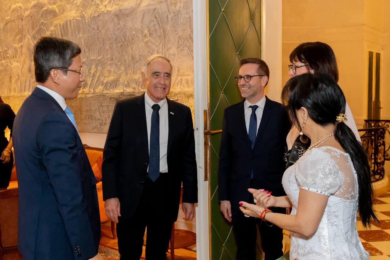 (ប៉ារីស)៖ លោក លុយ ដាវីត ឯកអគ្គរាជទូតកម្ពុជាប្រចាំសាធារណរដ្ឋបារាំង បានផ្សព្វផ្សាយពីមុខម្ហូបខ្មែរ ដល់ភាគីប្រទេសជាមិត្ត ដោយបានអញ្ជើញ លោក Hadrien GHOMI តំណាងរាស្រ្តតំបន់ Seine-et-Marne និងជាអនុប្រធាន ក្រុមមិត្តភាពរដ្ឋសភាកម្ពុជា-បារាំង និងអភិបាលក្រុងមួយចំនួនរបស់បារាំង រួមមាន អភិបាលក្រុង Bussy Saint Georges, Logne, Noisiel និង Croissy Beaubourg ចូលរួមកម្មវិធីអាហារពេលល្ងាច និងភ្លក់ម្ហូបខ្មែរ នៅ និវេសនដ្ឋានឯកអគ្គរាជទូត។