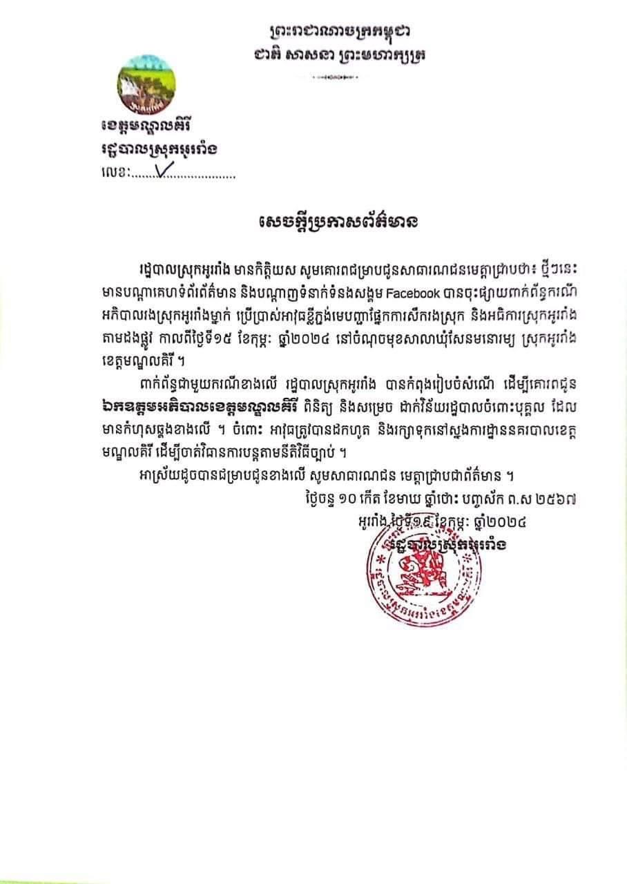 យោងតាមសេចក្ដីប្រកាសព័ត៌មានរបស់រដ្ឋបាលស្រុកអូររាំង ដែលបណ្ដាញព័ត៌មាន Fresh News ទទួលបាននៅថ្ងៃទី១៩ ខែកុម្ភៈ ឆ្នាំ២០២៤ បានបញ្ជាក់យ៉ាងដូច្នេះថា «រដ្ឋបាលស្រុកអូររាំង បានកំពុងរៀបចំសំណើ ដើម្បីគោរពជូន ឯកឧត្តមអភិបាលខេត្តមណ្ឌលគិរី ពិនិត្យ និងសម្រេច ដាក់វិន័យរដ្ឋបាលចំពោះបុគ្គល ដែលមានកំហុសឆ្គងខាងលើ។ ចំពោះ អាវុធត្រូវបានដកហូត និងរក្សាទុកនៅស្នងការដ្ឋាននគរបាលខេត្ត មណ្ឌលគិរី ដើម្បីចាត់វិធានការបន្តតាមនីតិវិធីច្បាប់»។