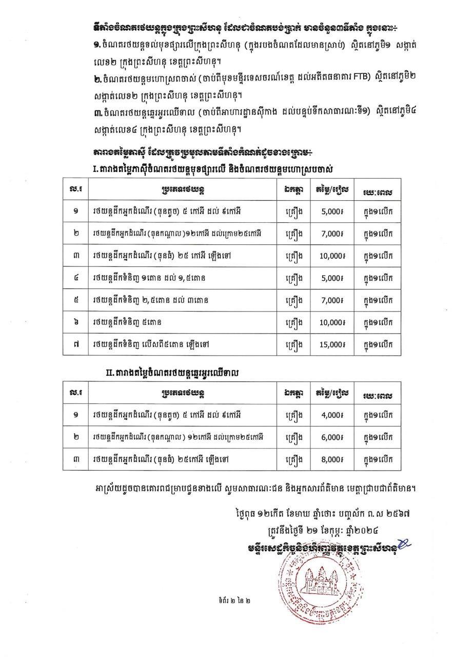 មន្ទីរសេដ្ឋកិច្ច ខេត្ដព្រះសីហនុ ចេញប្រកាសព័ត៌មាន ពីការប្រមូលចំណូល ពីចំណតរថយន្ដក្នុងក្រុង បង់ចូលថវិកាខេត្ដ