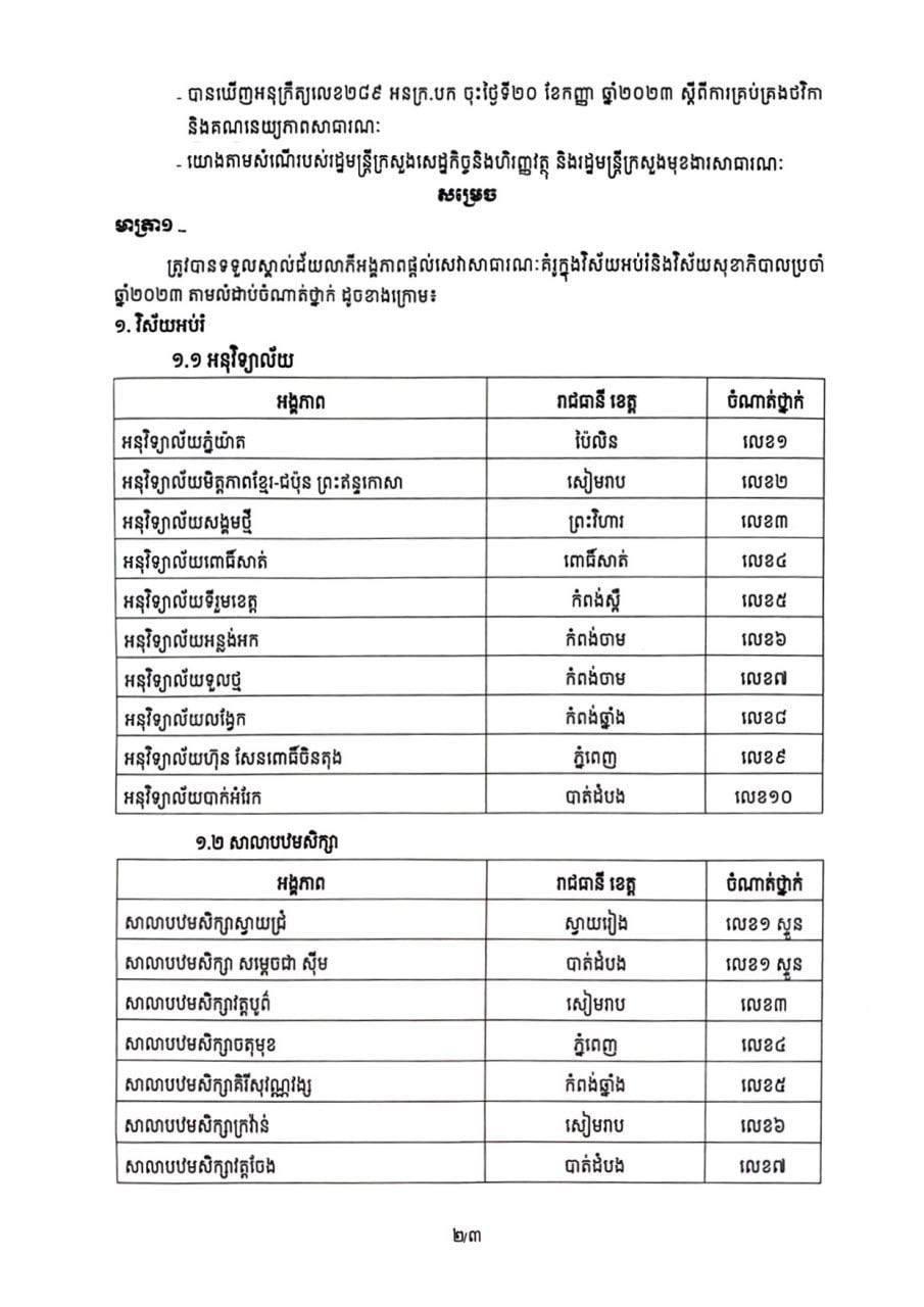 ក្នុងវិស័យអប់រំ គឺកម្រិតបឋមសិក្សាដែលផ្តល់សេវាសាធារណៈគំរូមានចំនួន១០សាលា និងកម្រិតអនុវិទ្យាល័យមានដែលផ្តល់សេវាសាធារណៈគំរូចំនួន១០សាលា។ ចំណែកឯវិស័យសុខាភិបាលដែលផ្តល់សេវាសាធារណៈគំរូក៏មានចំនួន១០អង្គភាពផងដែរ៕