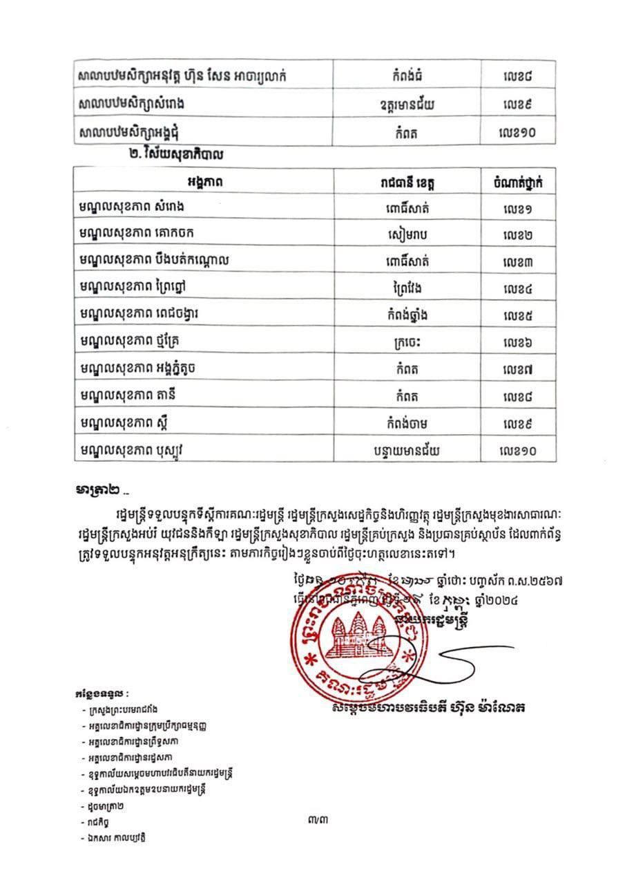 ខាងក្រោមនេះជាអនុក្រឹត្យរបស់នាយករដ្ឋមន្ត្រី៖