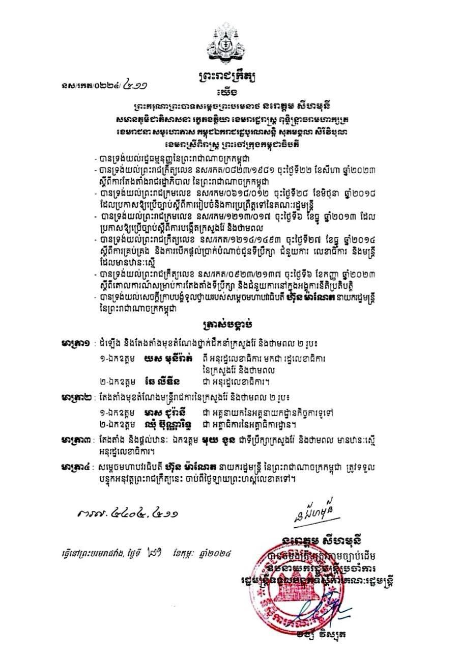 ខាងក្រោមនេះជាព្រះរាជក្រឹត្យរបស់ព្រះមហាក្សត្រ ដែលបញ្ជាក់ពីនាមរបស់ថ្នាក់ដឹកនាំ មន្ត្រីរាជការដែលត្រូវបានដំឡើង តែងតាំង និងផ្ដល់ឋានៈ សរុប៥រូបនោះ៖